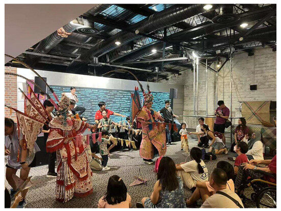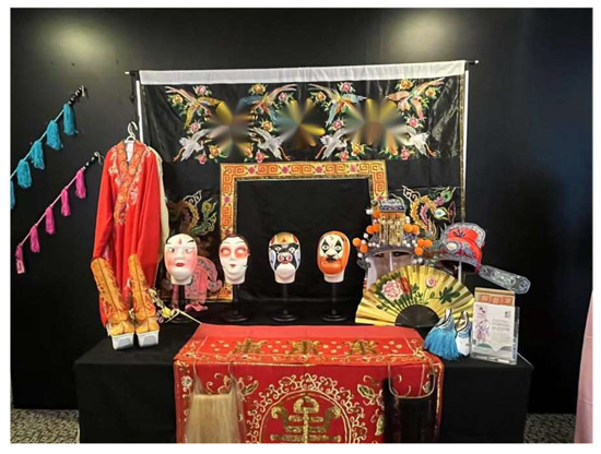In the course of participant observation, this study identified a notable shift in the performance model of Teochew opera within Malaysia’s secular context. Departing from the conventional “performer–audience” dichotomy that characterises traditional operatic presentations, contemporary stagings increasingly adopt a participatory performance framework. This emerging model reconfigures audience engagement by integrating spectators directly into the performative and educational dimensions of the event. Rather than positioning the audience as passive observers, participatory performances encourage active involvement through structured interaction, cultural learning, and embodied experience. This shift is particularly evident in government-sponsored performances and cultural festivals, where participatory strategies are intentionally embedded within the event design. Prior to the formal performance, audiences are often introduced to the symbolic language of Teochew opera via guided exhibitions (as shown in Figure 12), interpretative signage, or live demonstrations of key performative elements such as gesture, costume, or vocal techniques. These knowledge-sharing components not only facilitate a deeper understanding of the art form’s aesthetic codes but also broaden access for non-Teochew-speaking and multi-ethnic audiences.