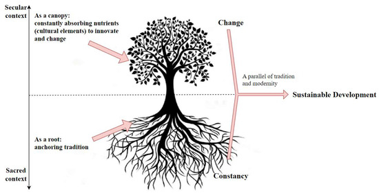 The duality of the sacred and the secular in Teochew opera is a fundamental basis for its sustainable development. This interplay can be visualised as a tree, as shown in Figure 16. The sacred aspect is the root of stability, which anchors the tradition in rituals and communal belief, ensuring continuity and reverence for its cultural heritage within the Malaysian landscape. Conversely, the secular aspect represents the canopy, which constantly absorbs nutrients (cultural elements) to innovate and change, allowing the art form to adapt and resonate with broader audiences. Thus, this duality preserves the opera’s integrity and enhances its relevance within a modern cultural landscape.