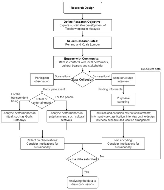 The fieldwork for this study spanned from November 2022 to December 2023, encompassing a full calendar year to capture the temporal rhythms and sociocultural dynamics that shape the sustainability of Teochew opera in Malaysia. This extended duration enabled observation of various performances across sacred and secular contexts, including temple celebrations, deity birthdays, ancestral rituals, and multicultural festivals. Such immersion facilitates familiarity and trust-building, while also revealing culturally sustainable approaches from both insider and outsider perspectives.