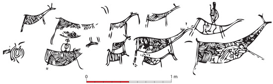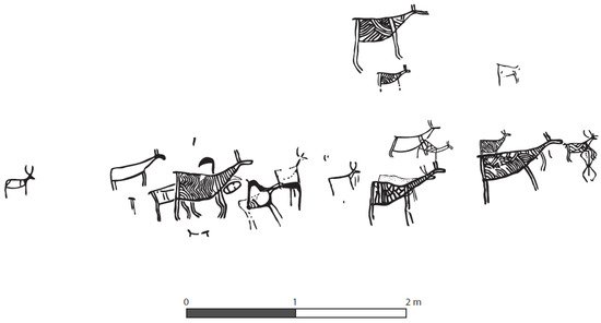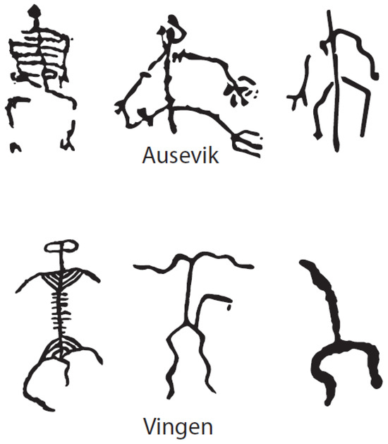 A common challenge when dealing with rock art is to qualitatively decide whether the iconography and its associated compilations represent mythological, cosmological, or even creational narratives. On the basis of ethnography, it seems reasonable to suggest that the egalitarian hunter–fisher–gatherer societies behind the iconography related their images to conditions and world views where most of their surroundings were animated and where cosmology, mythology, religion, and subsistence were interconnected (e.g., Descola 2013; Viveiros de Castro 1998). It is further reasonable to suggest that, for the societies that roamed and settled in Mesolithic Scandinavia, this also implied a coexistence with forces, influential spirits, ancestral souls, and other corresponding elements for both humans and animals in their environment, which were perceived to be just as real as living humans and animals (Hallowell 1975; Morrison 2000; Guemple 1994; Rio 2020; Mosko 2008; Jordan 2011).