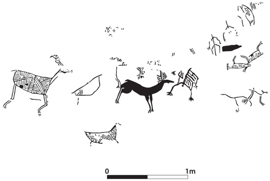 Somewhat similar to the human skeletons are visualisations of many animal images that seem to take the character of defleshed or excarnated cervids. Some reservations can also be raised against this interpretation, as most animal images in the iconography are highly stylised. However, explicit differentiations between animals are accounted for in various compilations of the images where muscles and flesh are clearly visualised, creating a distinction against animals with a lack of such features and defleshed characteristics (Figure 4). The latter could include representations of dead cervids, but similarly to the human figures mentioned above, they are depicted as highly active and performative, as well as interacting with the human skeletons (Figure 5).