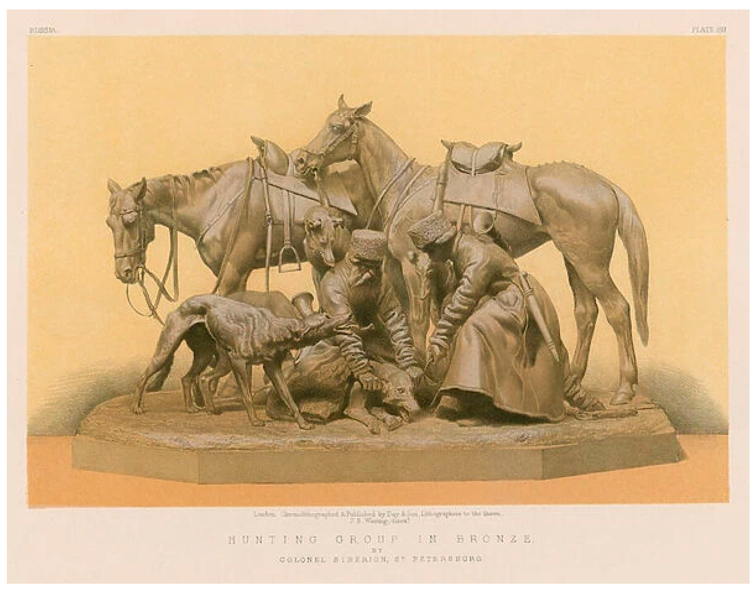 These various reviews confirm that, if the range of media represented had expanded since the Great Exhibition, key terms of discussion were retained. High-quality materials were recognised. Fanciful decoration was relished. Ingenious design was acclaimed. Significantly, these criteria of excellence also applied in Waring’s assessment of the bronze sculptures in their inaugural display. Witness the rhapsodic account of three hunting groups by Nikolai Lieberich, an artist of German origin who, following service as a military officer, had studied under Petr Klodt and been appointed an Academician in St Petersburg the previous year (