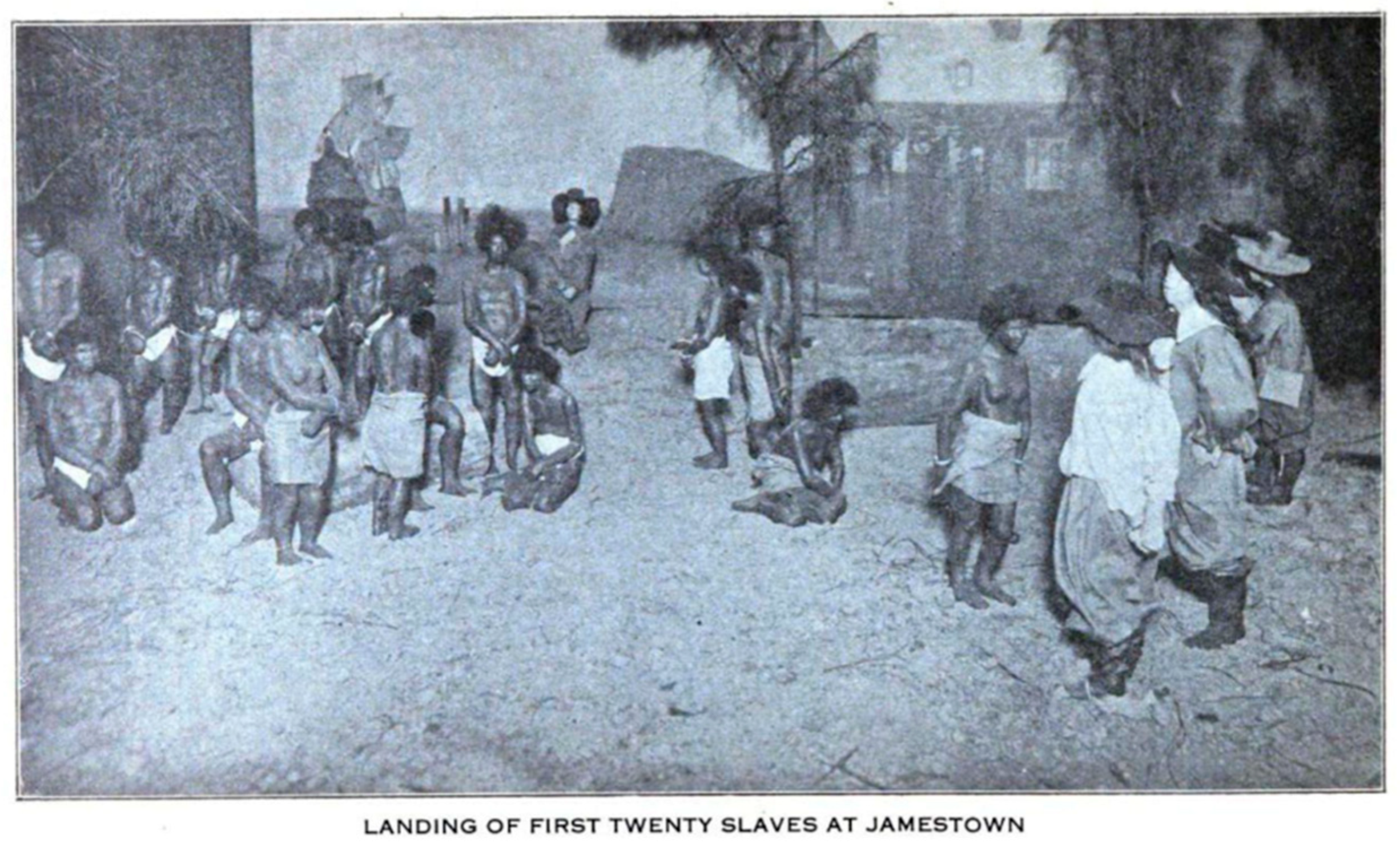 Figure 10). White traders are in the foreground, grasping incoming enslaved people forcibly by neck and head. Compositionally, Dawson’s design echoes Fuller’s with the building at right, transforming her painted ship at left into a model ship at left, and diagonal trajectory of enslaved people moving from left to right and background to foreground. A foreshortened effect of scale of enslaved people in chains being paraded from the boat highlights multitudes. The ship wharf buildings at both sides define the port scene parallelled across many locations along the coasts of North America, marking the architecture as archetype. However, there is some suggestion that the blue haint color of the building may have resonated with some African religions (