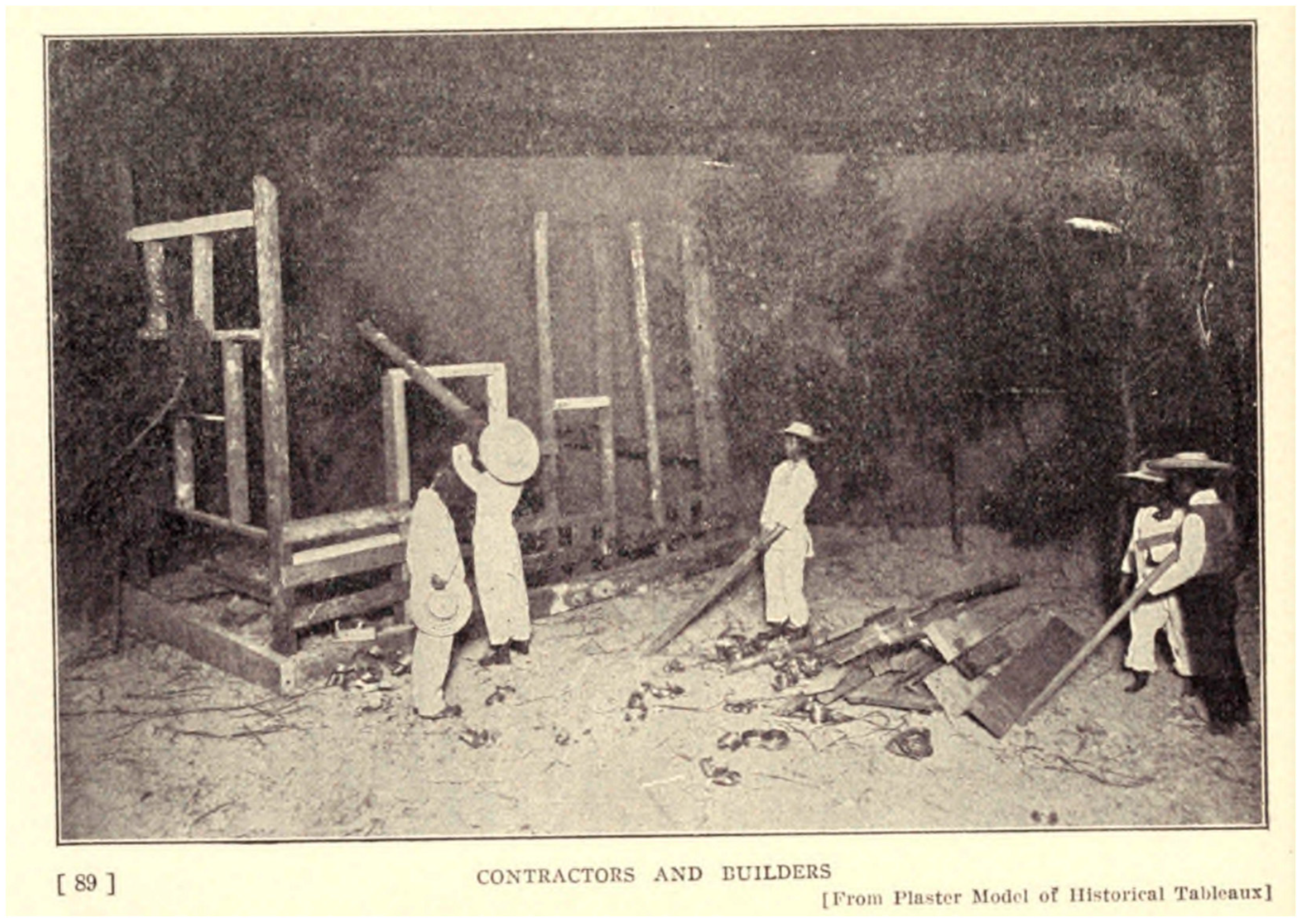 The tremendous mobility of the dioramas and the politically potent potential of the miniature render the architecture and its meanings fluid. Hunster’s models traveled from Washington DC, to Paris, to Buffalo, New York, then back again. Fuller’s models, made in Philadelphia after memories from Paris, were then transported to Jamestown, Virginia, and flattened into book form in the only volume that holds known photographs of these dioramas. Yet that book had and continues to have wide circulation (