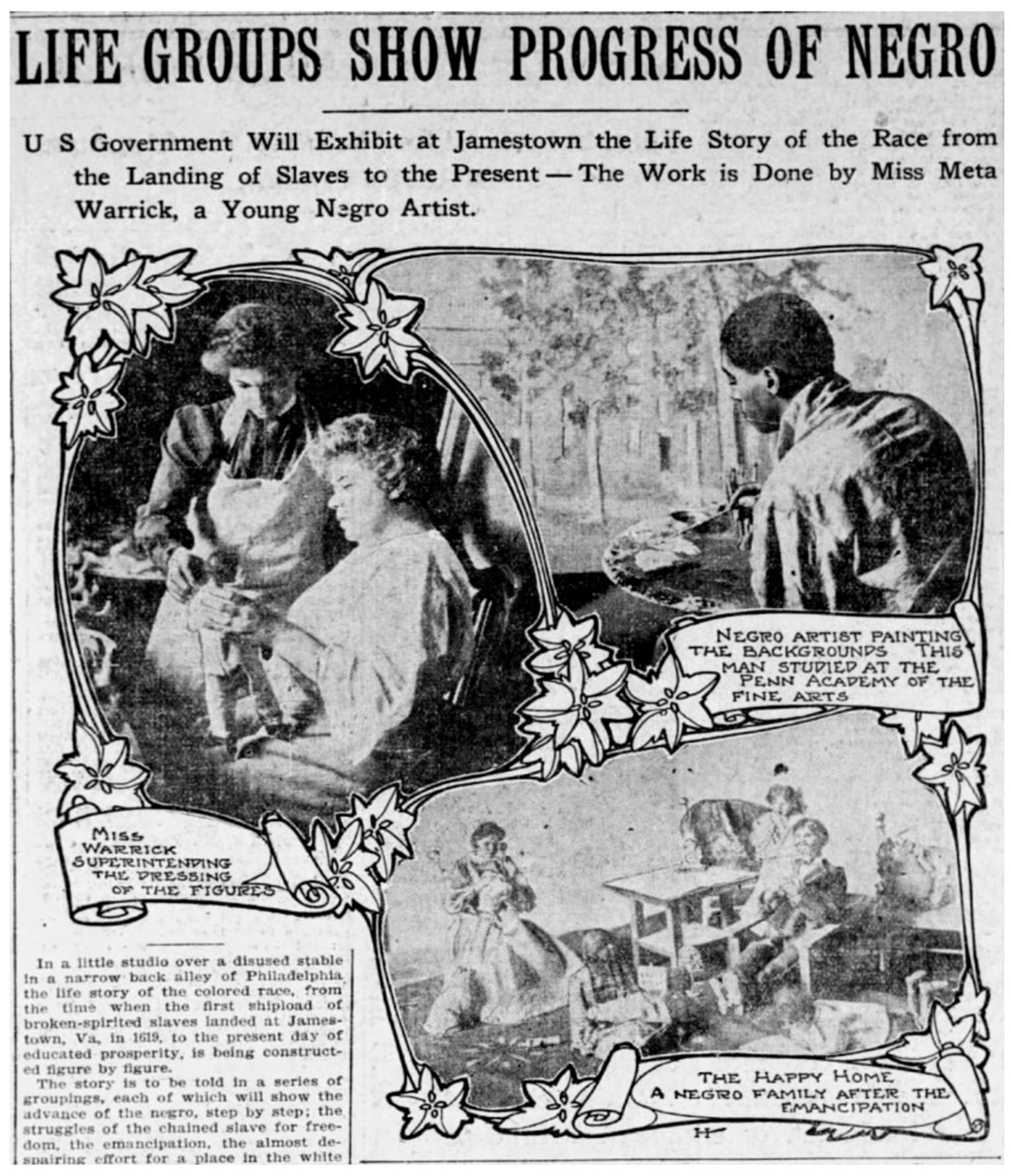 From the Universal Exposition in Paris in 1900 to the Pan-American Exposition in Buffalo in 1901, and from the Jamestown, Virginia Tercentennial Exposition of 1907 to the American Negro Exposition in Chicago in 1940, diorama series made by African American artists explored and celebrated Black histories. Conceived for the “Exhibit of American Negroes” at the Paris Universal Exposition in 1900, Washington DC artist Thomas W. Hunster’s model series began a practice of using the diorama as an interruptive medium with nine models that subsequently traveled with parts of the “Exhibit of American Negroes” to Buffalo, New York. Sculptor Meta Vaux Warrick Fuller expanded the size of the diorama projects for a series of fourteen she designed after her studies in Paris for the Jamestown Ter-Centennial Exposition in 1907. In 1940, Charles C. Dawson participated in developing a monumental undertaking of 33 models for the Chicago American Negro Exposition. The dioramas built on each other, each one affirming and expanding on the episodes, producing a fungible and evolving narrative about African American history and cultural progress in the context of oppression.