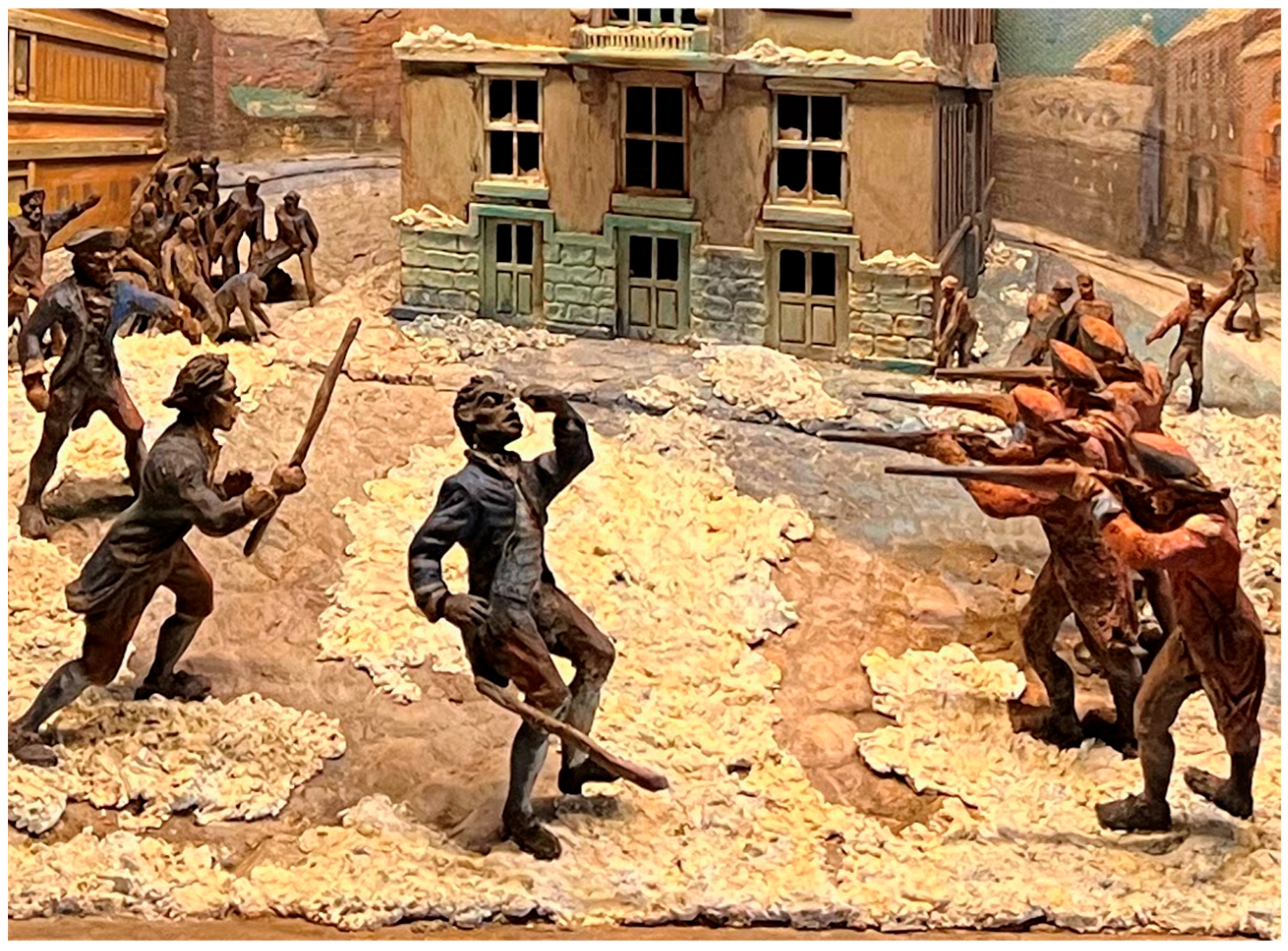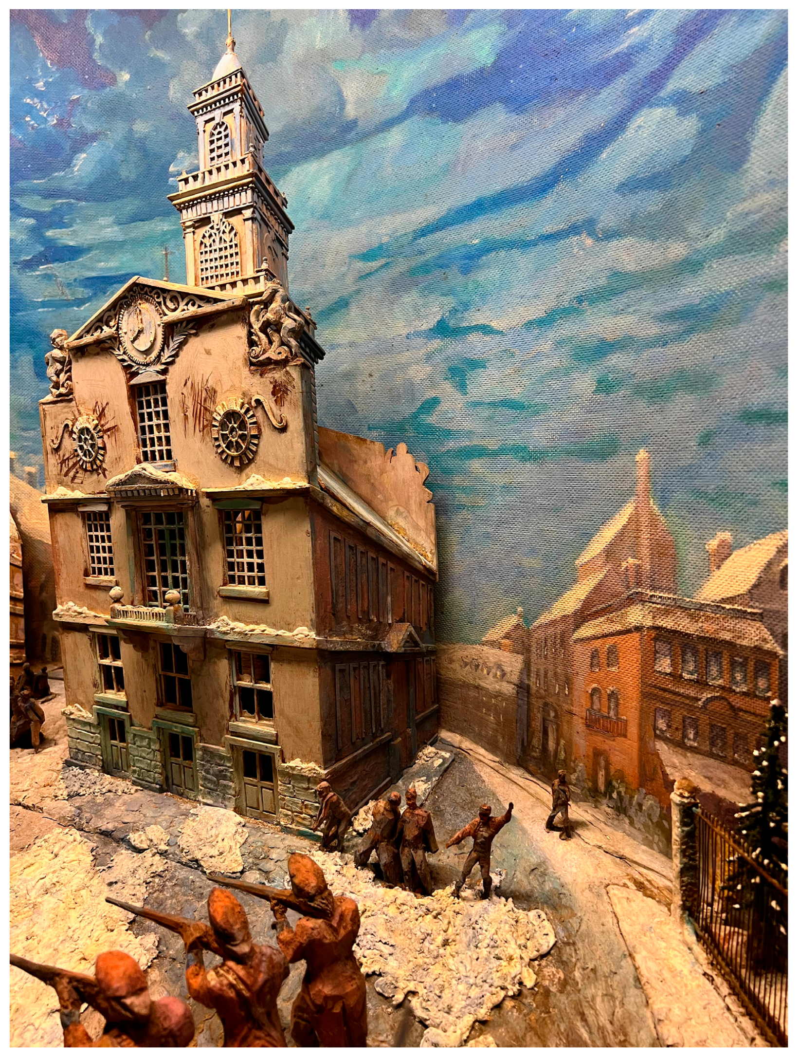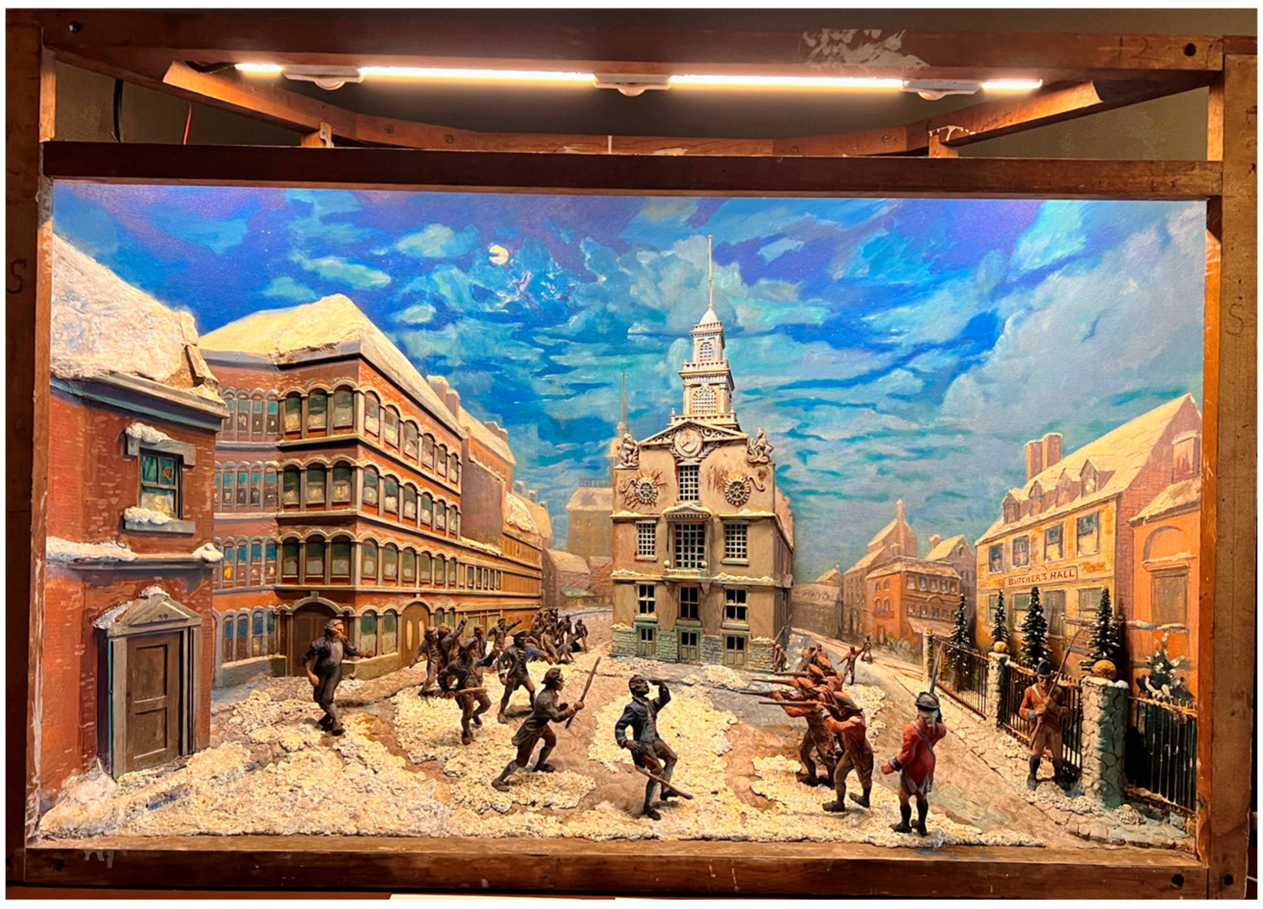 Building on a strategy of specificity that characterized some of Hunster’s and Fuller’s dioramas, many of the dioramas are sited in the United States, taking place in identifiable locations and figuring key moments in African American contributions to U.S. society and history. For instance, the first individual killed in the Revolutionary War, Crispus Attucks (c. 1723–1770), who was Afro Indigenous, is placed in front of a replica of the Old State House in Boston viewed from the southwest (