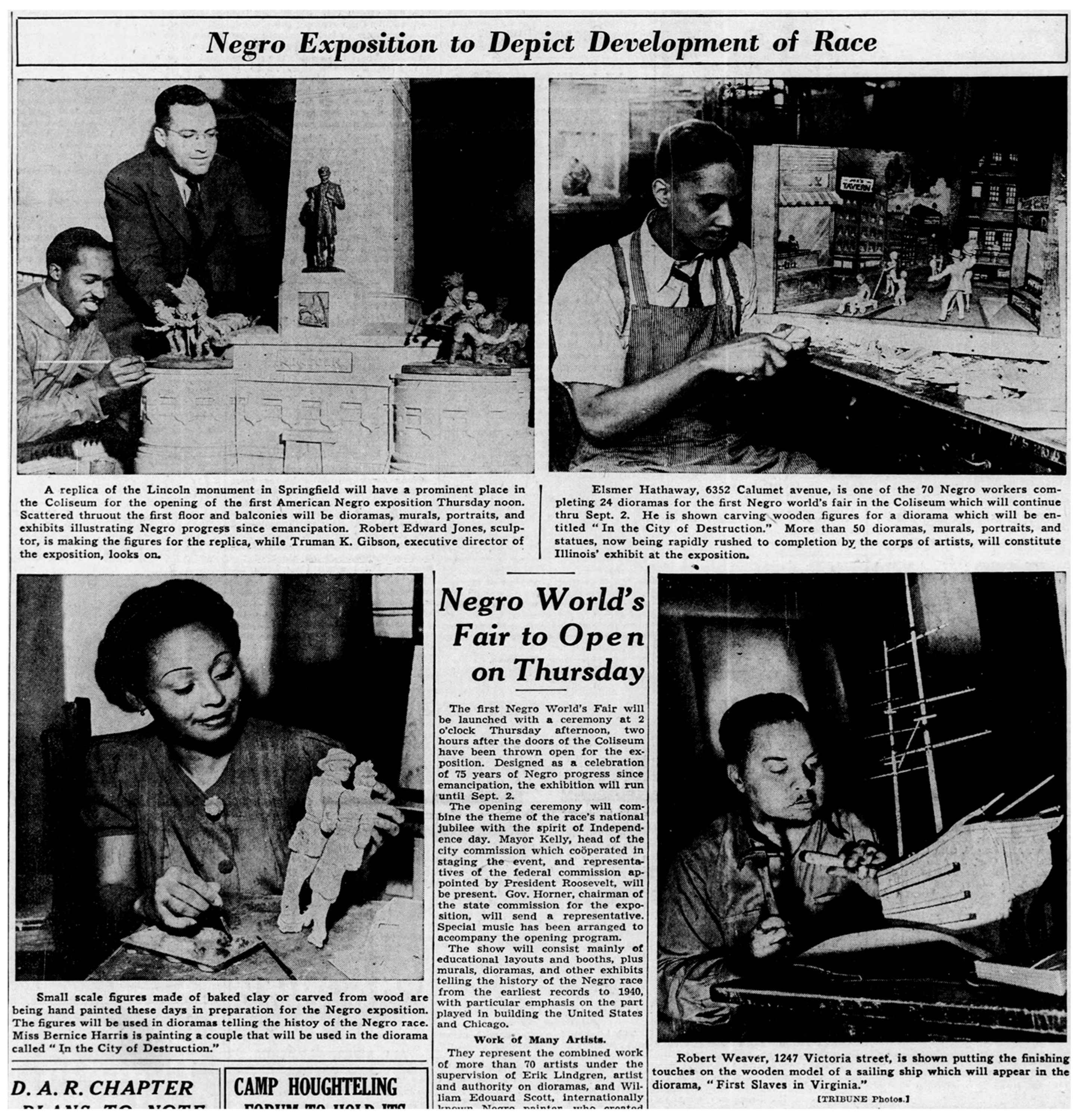 Prepare Negro Exposition 1940). A discussion of musician Duke Ellington’s puzzlement at the dioramas mentioned that he “visited studios where 70 artists are finishing up 24 murals and 20 dioramas to be used by the Exposition (