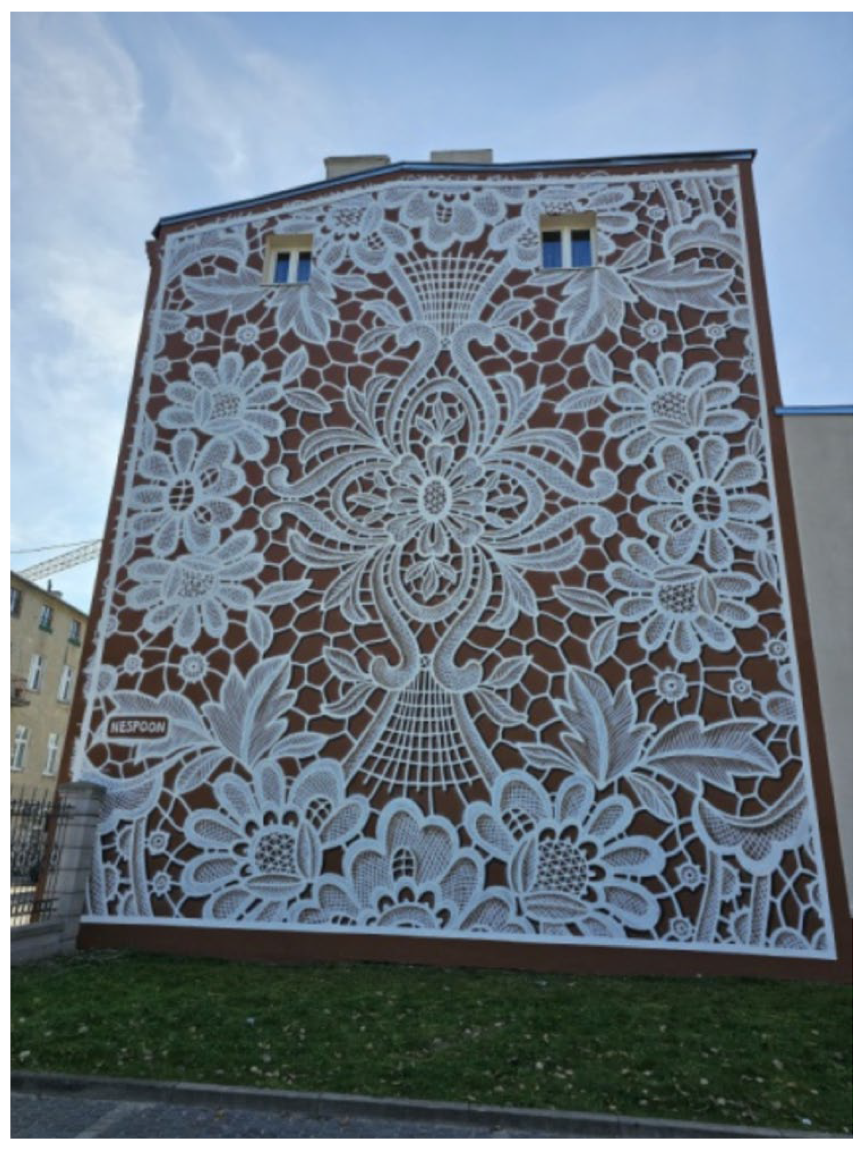 - Nasze Miasto Łódź. 2024. W Łodzi Powstał Nowy Mural Autorstwa NeSpoon. Skąd w Artystce Ogromne Zainteresowanie Koronką? [Photograph]. Naszemiasto.pl, May 5. Available online: https://lodz.naszemiasto.pl/w-lodzi-powstal-nowy-mural-autorstwa-nespoon-skad-w-artystce-ogromne-zainteresowanie-koronka-zdjecia/ar/c13p2-26918423 (accessed on 15 July 2025).