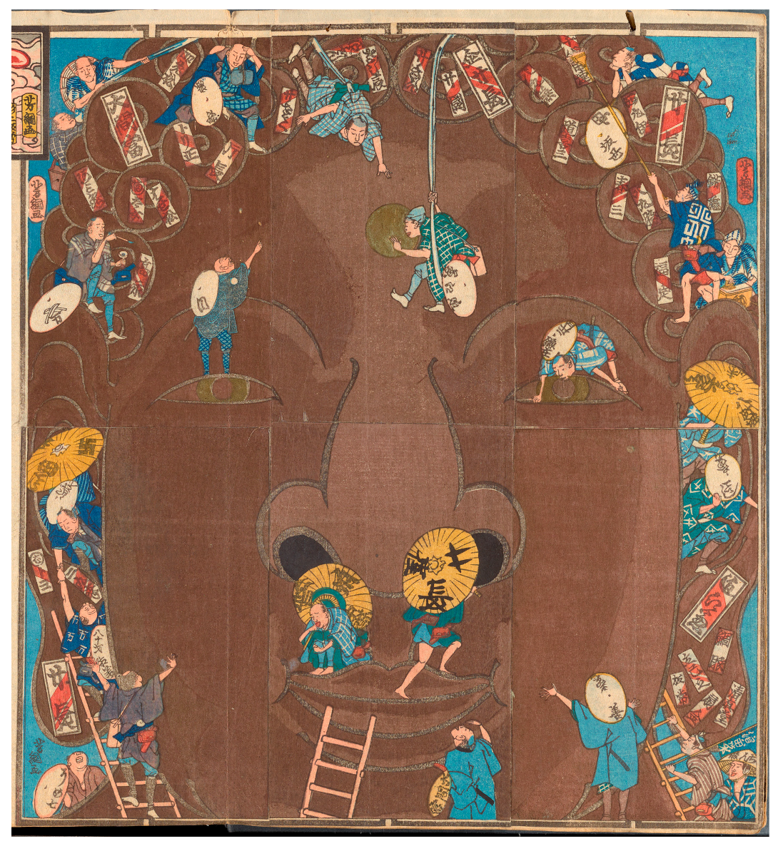 And the crowning amusement is what we see taking place at the top of the image. A pair of men on the top left, perched amid the Buddha’s curls, are holding a long strip of cloth, at the end of which another man dangles head-first over the icon’s forehead, reaching toward the gold circle representing his byakugō 白毫 (Skt. ūrṇā; the auspicious mark on the Buddha’s forehead); another man is already there, seated in a looped strip of cloth held by invisible comrades on the other side of the Buddha’s head. What are these two men up to, aside from daredevil climbing? A hint is provided by the wooden box hanging at the seated man’s waist. Similar boxes can be seen elsewhere in the print, with the most telling example being the one at the far right, just above the Buddha’s left ear. These boxes contain votive slips, and the men holding the boxes are preparing to paste slips on the surface of the icon itself.
