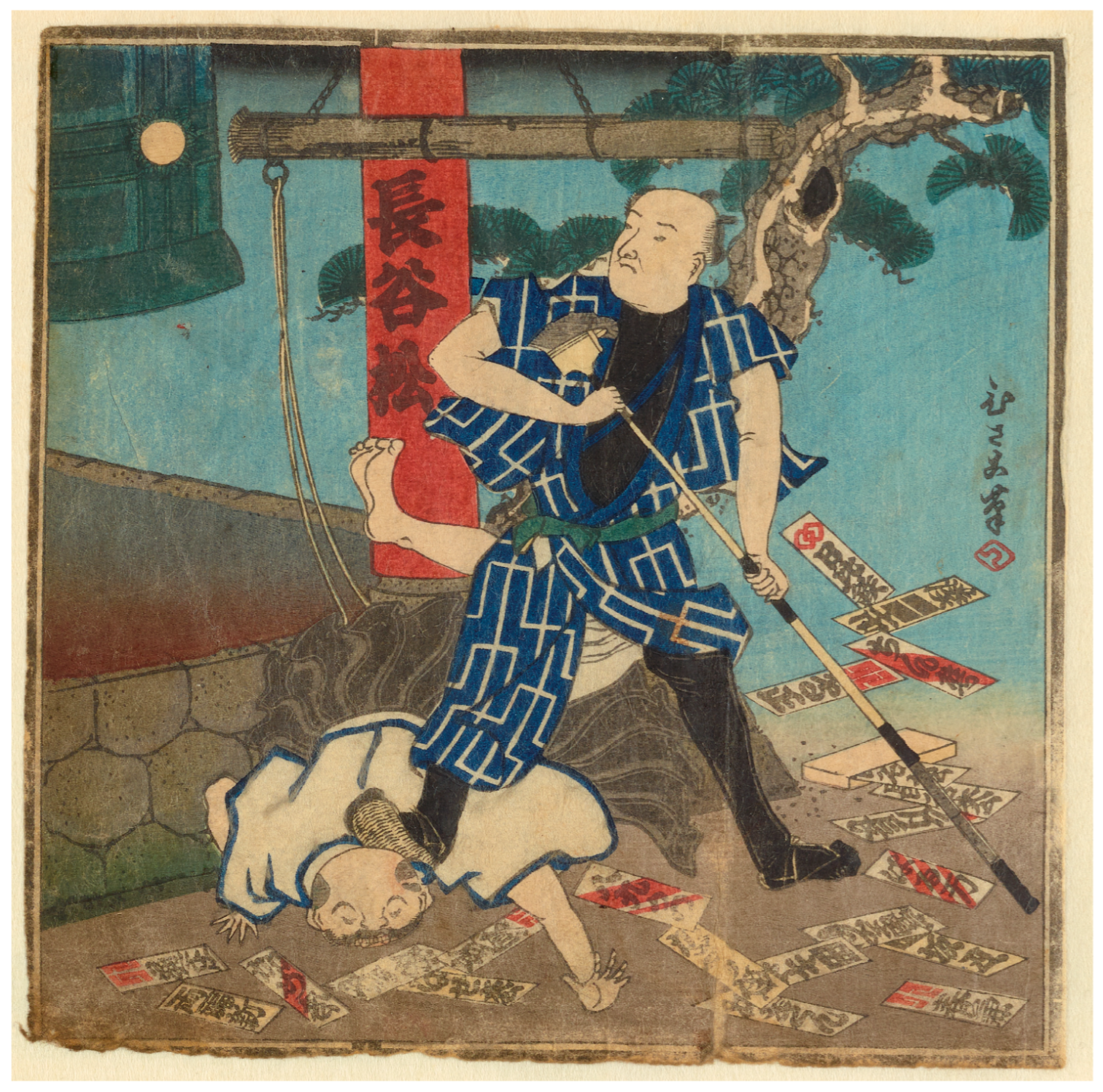 nōsatsu enthusiast in an altercation with a priest. The scene is a Buddhist temple, as indicated by the large bell partly seen in the top left, meant to be struck with the log suspended over the men. The man at the center of the composition is clearly a paster caught in the act—he holds a pasting pole similar to those seen in