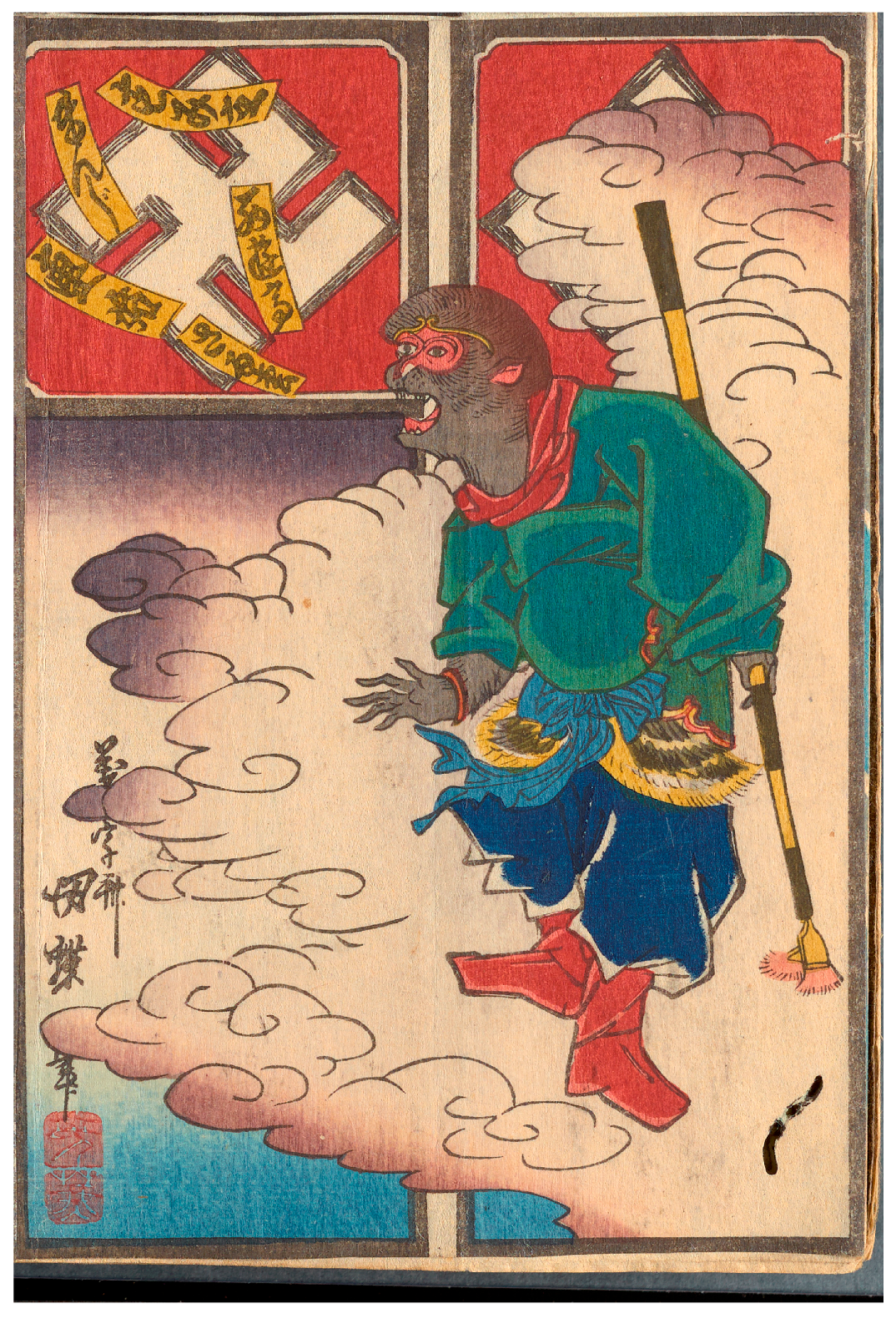 chō slip is one of a series produced by the Manjiren 卍連 or Swastika Club (the swastika being, of course, a common Buddhist symbol), and depicts the legendary figure of Son Gokū 孫悟空 (Ch. Sun Wukong), the Monkey King who stars in the influential Ming-era vernacular novel