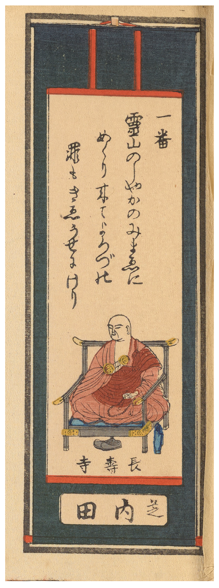 Figure 5) is labeled “Chōjuji” 長寿寺, a temple in Takanawa 高輪 now known as Kōya-san Tokyo Betsuin 高野山東京別院. Above the portrait, each slip contains a number (referring to where the temple falls in the Gofunai circuit) and a calligraphed poem. These poems are the