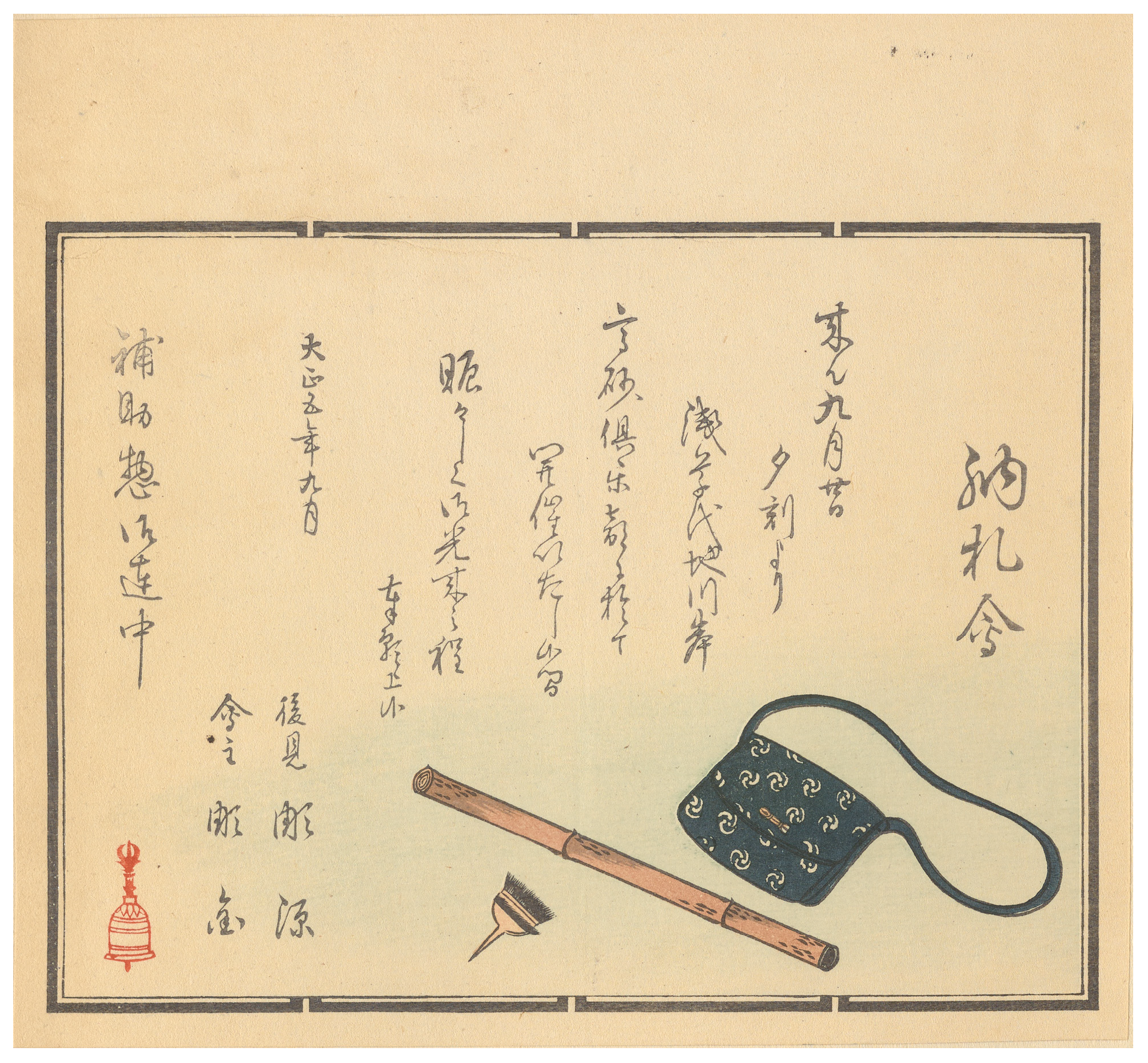 gokorei 五鈷鈴) depicted in red in the bottom left corner. The announcement slip does not name the club sponsoring the meeting, but this information is conveyed pictorially through the brush, pole, and pouch depicted on the announcement slip. These are, of course, tools associated with