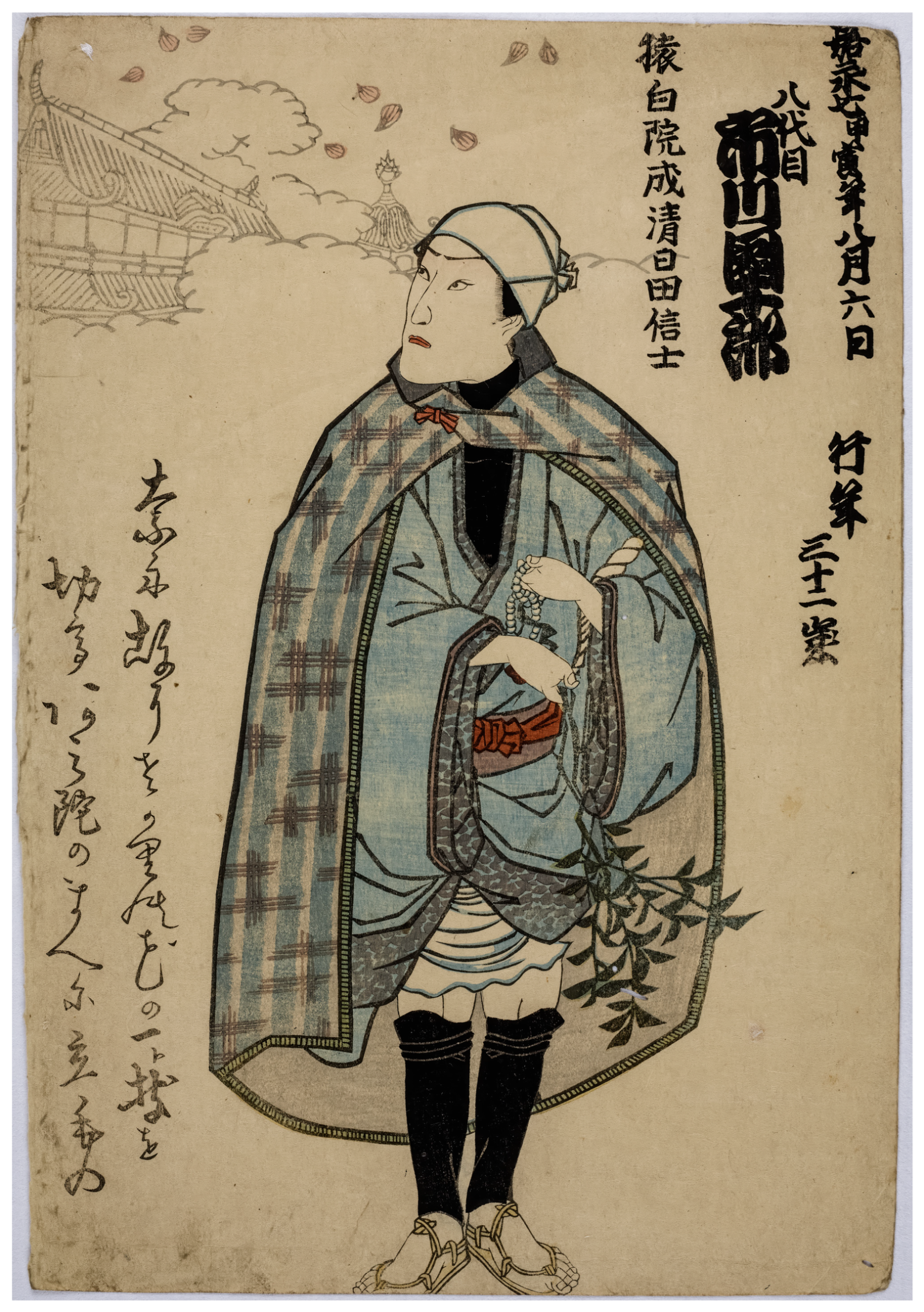 Figure 10, for example, an anonymous 1854 print, depicts Ichikawa Danjūrō 市川團十郎 VIII, who had just died; he is presented in the garb of a traveler, holding prayer beads and a sprig of