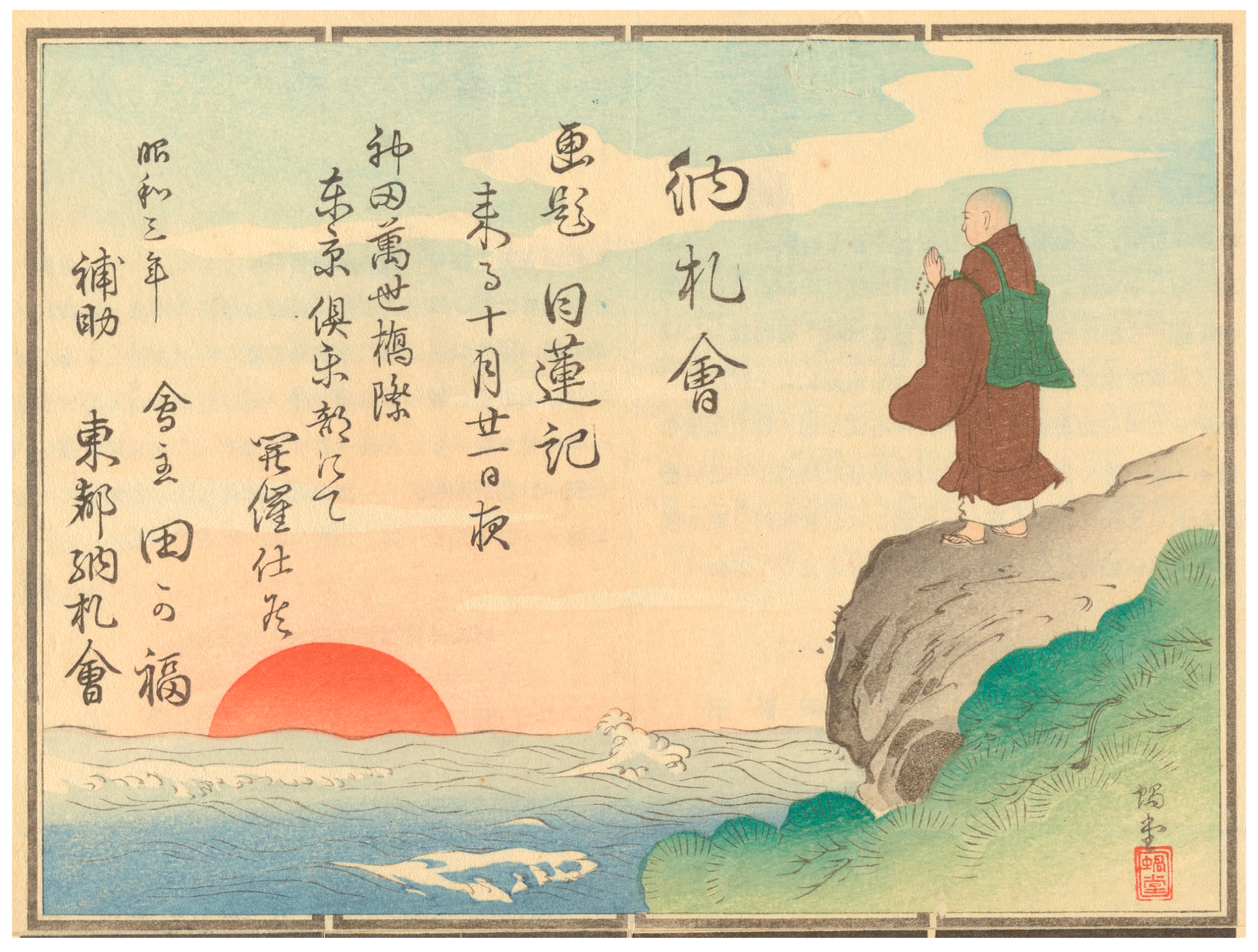 13The announcement features a depiction of Nichiren atop a seaside cliff facing the rising sun, a reference to perhaps the pivotal moment in his life when he first recited the Lotus Sutra mantra namu myōhō renge kyō 南無妙法蓮華経 (“hail the wondrous law of the Lotus Sutra”) in a grove at the temple of Seichōji 清澄寺 (also known as Kiyosumidera; present-day Chiba prefecture), the symbolic founding of his movement. The illustration is by an artist known only as Kadō 蝸堂 (no dates; he is known to have produced prints related to the Sino-Japanese [1894–1895] and Russo-Japanese [1904–1905] wars), whose signature appears on some of the other slips in this series, making it likely he did all of them.