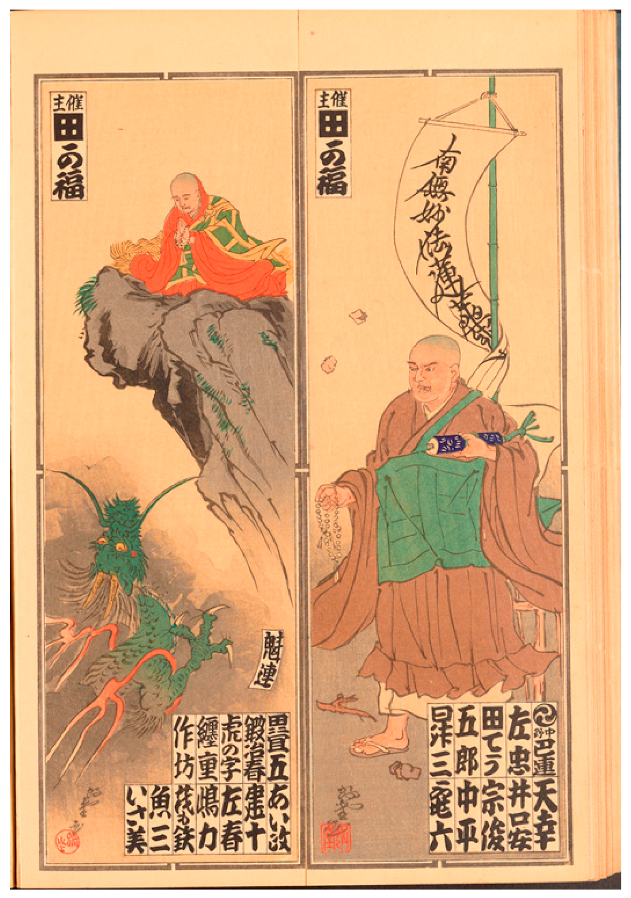 daimei representing Takafuku, as host, and a further group of sponsors. The slip on the right depicts a young Nichiren preaching in the street, in front of a banner bearing his familiar Lotus Sutra mantra. The one on the left presents an older Nichiren (in the garb of a senior cleric) seated on a cliff in prayer, while a dragon approaches him from below.