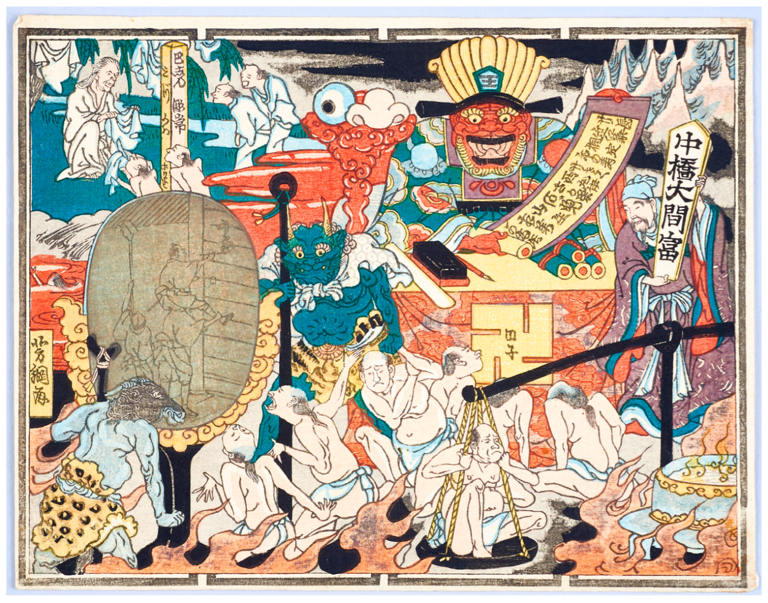 The mirror in this set is blank, but any viewer familiar with Yoshitsuna’s hell scene might guess that at least some of the sinners depicted here are being punished for pasting senjafuda. This assumption is bolstered by the text found on the announcement slip, which reads: