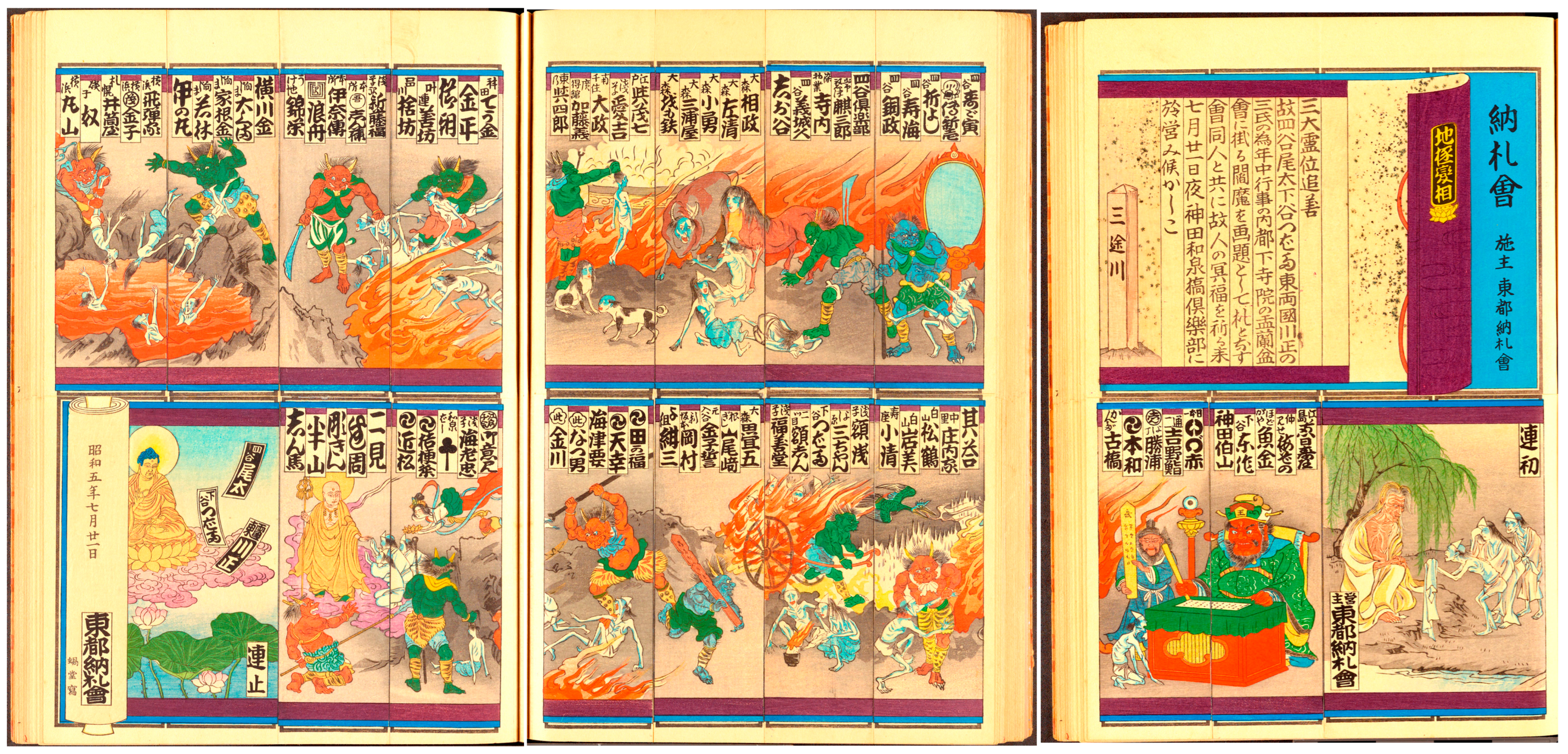 Most of what follows is a more detailed version of the hellscape depicted in the Yoshitsuna four-chō slip just discussed. The ren-hajime slip shows Datsueba relieving newly arrived dead souls of their robes. This is followed by a scene of Enma at his desk, complete with scepter-holding majordomo, Seeing Eye/Sniffing Nose, and the mirror. Hell’s torments are depicted in much more detail here and include no fewer than thirteen hell wardens overseeing a boiling cauldron, a flaming cart, a lake of blood, and a myriad of souls in agony. But the final one-chō slip provides hope, showing Bodhisattva Kṣitigarbha, or Jizō 地蔵, accompanied by heavenly beings, appearing to deliver three sinners from their torment. The sequence concludes with the ren-dome, which shows Amida Buddha in his Pure Land, where the three saved souls are bound. The ren-dome also shows the scroll’s spindle, thus bringing us out of the metapictorial space. On the spindle is text dating the series (21 July, Shōwa 昭和 5/1930) and identifying the artist (Kadō again), along with a daimei for the Tōto Nōsatsukai itself.