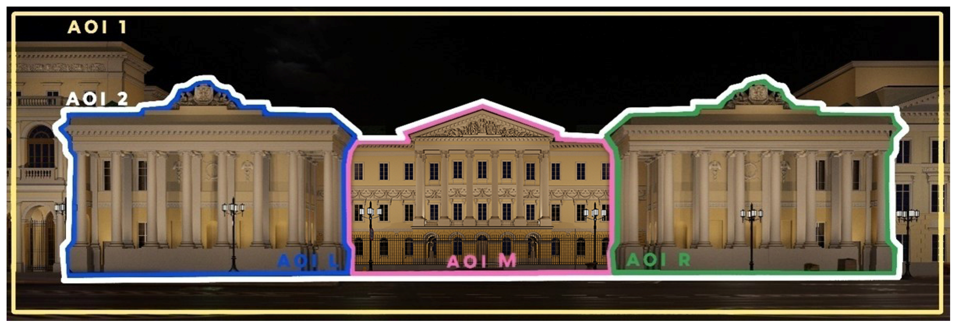 The analysis of the data collected during the ET study was divided into three stages. Stage I involved the segregation and systematization of the research material. Stage II consisted of a general analysis of the observers’ visual engagement with the entire visualization and the monument as a whole (AOI 1 and AOI 2) considering the different illumination variants. Stage III focused on a more detailed analysis of the attractiveness of individual planes, concentrating on the successive parts of the building (AOI L, R, M). In separate stage the subjective preferences of the observers, collected through a questionnaire, were examined.