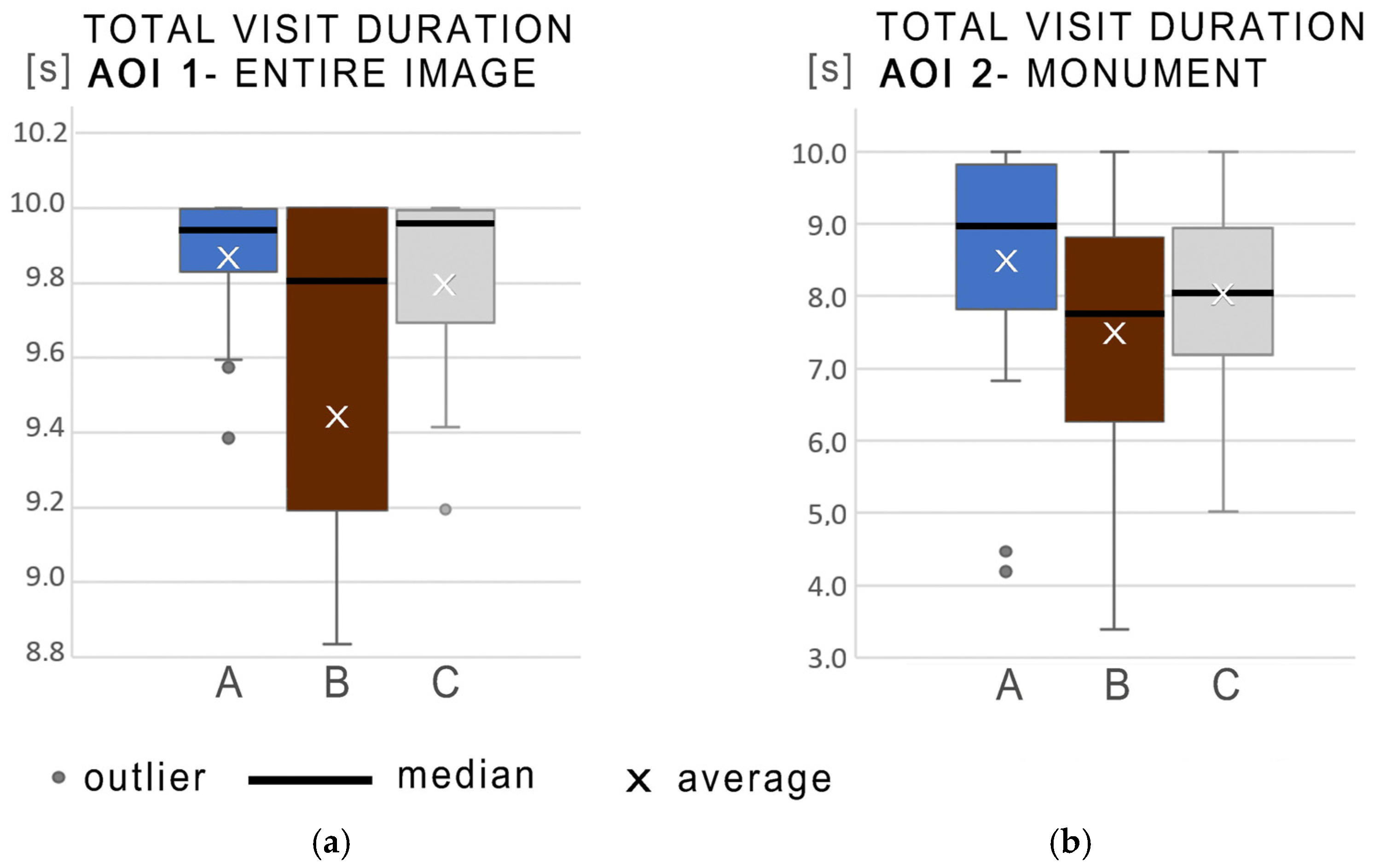 The first parameter that exhibited significant deviation between the three stimuli was the Total Visit Duration within AOI 2—which means the total amount of time spent looking at the monument in its entirety. The analysis of data presented on a chart (