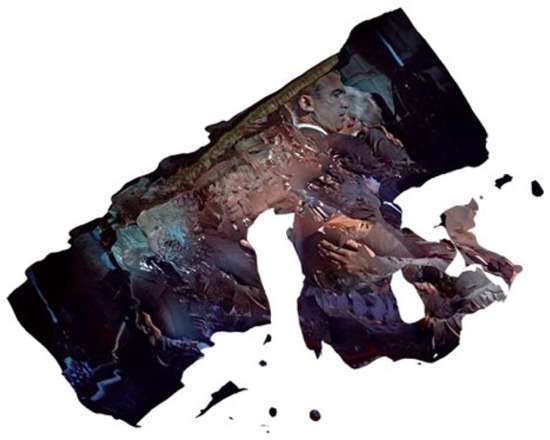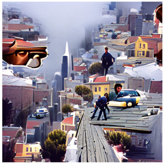 From the very beginning, a robotic voice accounts for John Scottie Ferguson’s rooftop chase across San Francisco, then evokes his sudden acrophobia, as well as other key elements of Vertigo’s original storyline. Each part of this condensed narrative is accompanied by a flow of images that evolve according to their own internal logic, gradually morphing through small visual fragments that coexist in a multi-dimensional space. The result looks like a hybrid patchwork with disfigured faces and distorted patterns. Parts of police cars embedded in a cityscape of rooftops and skyscrapers can be discerned, as well as cables of the Golden Gate Bridge entangled with passers-by, then dissolving into the waters of the Bay (Figure 3 and Figure 4).