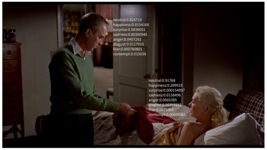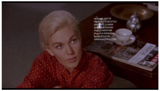 Before turning to The Kiss series, forming the central focus of this paper, it is worth considering another of Chatonsky’s early reconfigurations, which further confirms his attempt to reveal latent digital contents of the 1958 feature film. Completed in 2015, Prediction is presented on the artist’s website as a three-minute video, which shows the scene in which Madeleine/Judy wakes up in Scottie’s apartment after he has rescued her from drowning. The scene is kept in its integrity, but the protagonists are systematically accompanied by six lines of code. Each consists of about ten digits inscribed directly onto the shots, corresponding to different emotional states: neutrality, joy, surprise, sadness, rage and disgust (Figure 5).7 When they share the frame, Scottie and Madeleine seem to be conversing in this encrypted language, as a silent dialogue that may either complement or contradict their spoken exchanges, still audible all along (Figure 6).