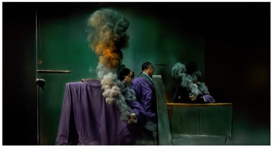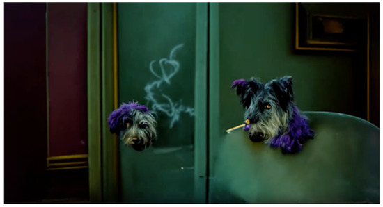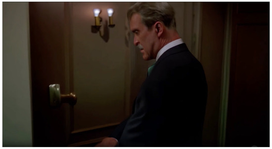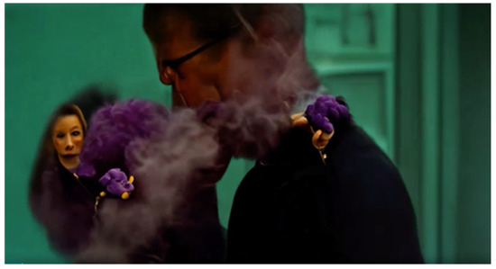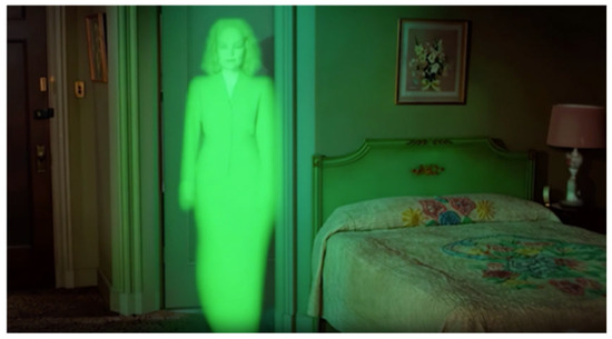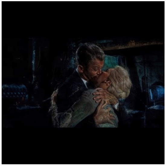 The Kiss 5 visually resembles the second and third reconfigurations but remains marked by the shift operated in The Kiss 4, as it also underlines the potential aging or evolution of the characters. Right after the opening of the 5-min video, Scottie indeed appears with a thick gray mustache, Madeleine as a glowing green specter, or with hardened features that accentuate the potential passage of time since the first occurrence of Vertigo (Figure 14 and Figure 15).