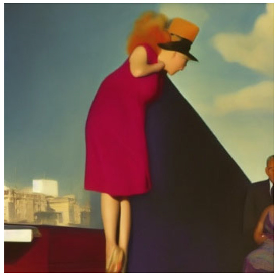 All the stills in the series are marked with a strange déjà-vu quality, having no trace in any existing reality but being produced from the accumulated data of humanity’s collective heritage. The effect of resemblance produced by The Kiss 4 arises mainly from the bourgeois interiors typical of the 1950s, which constitute the main visual frame, as well as from West Coast landscapes, which are easy to situate within a familiar space-time. Vertigo is also being dreamed up within aesthetic frameworks and periods that are foreign to him, as some scenes evoke, for example, the style of certain canvases by René Magritte, presenting simplified figures whose silhouettes stand out against an azure sky (Figure 12). This rapprochement between Hitchcock’s films and the pictorial tradition is central in the work of French artist Laurent Fiévet, particularly in his 2014 video diptych Carlotta’s Way and Returning Carlotta’s Way. In these works, Fiévet superimposes slowed-down excerpts from Vertigo onto fragments from Diego Velázquez’s Las Meninas (1656). The resulting palimpsest invites a fresh reading of the motifs present in each work and highlights multiple instances of accidental correspondences, giving the impression that certain gestures and elements echo one another, such as the golden curls of Velázquez’s young girls intertwining with Kim Novak’s hair. In this way, a cinematic effect permeates the painter’s work, while the suspended shots from Vertigo are enriched, appearing to absorb Las Meninas.
