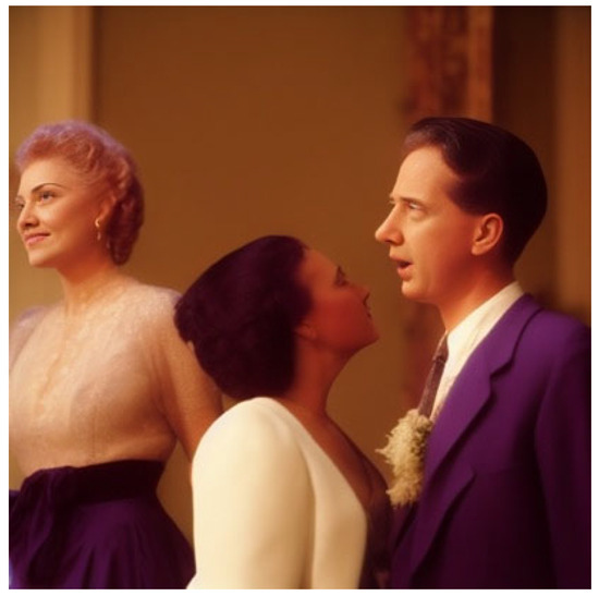 Despite the presence of clichés (the characters adopt conventional postures, the men have slicked-back hair and women tightly wound chignons) the short series of still images progressively reveals the possibility of challenging Hitchcock’s archetypes. Without knowing to what extent the artist intentionally guided the prompts to work against stereotypical patterns often reproduced by generative images, a vast number of generated versions of Madeleines appear in all skin tones and hair colors, echoing Judy’s original transformation (Figure 13). We are facing stills that do not fully escape dominant logics of representation but at least disorient them by disrupting the iconic Hitchcockian blonde. With this specific reworking, Chatonsky explores the marginal zones of the latent space, where new forms of visibility for minoritized existences can be invented. Indeed, racialized characters become central figures within the recomposed images, occupying space and moving through an environment that remains heavily codified. In doing so, they emerge as agents of a renewed history of Hollywood classicism, no longer shaped exclusively around the white standard and the implicit norms that dominated classical Hollywood production (whiteness as the ideal of beauty and the stereotyping of racial minorities), but rather opening the narrative to all. While AI is itself shaped by aesthetic and political norms that perpetuate canonical models (since it feeds on them), The Kiss 4 creates space for identities that are often erased or misrepresented in mainstream imagery.