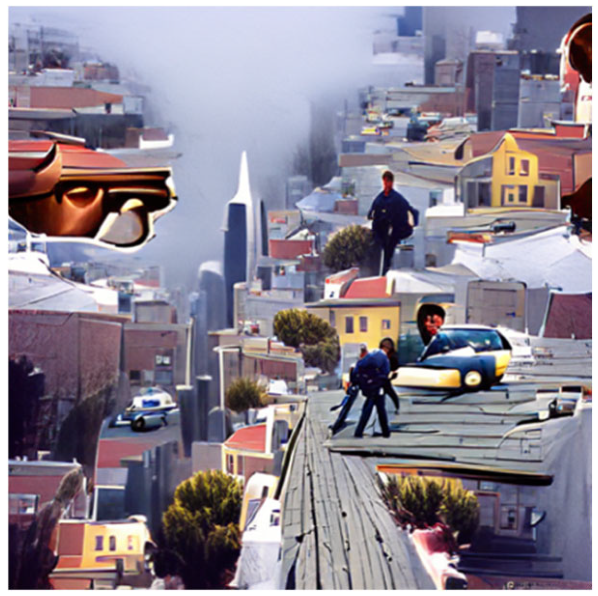 Figure 17). If they are likely guided by the prompt, they produce the effect of disparate elements emerging from the machine’s dream as it re-visualizes the original scene, especially as the music, distorted and slowed down, no longer helps to find the original path.