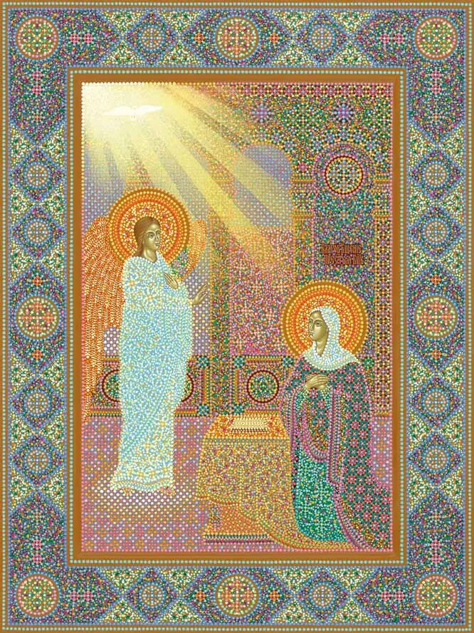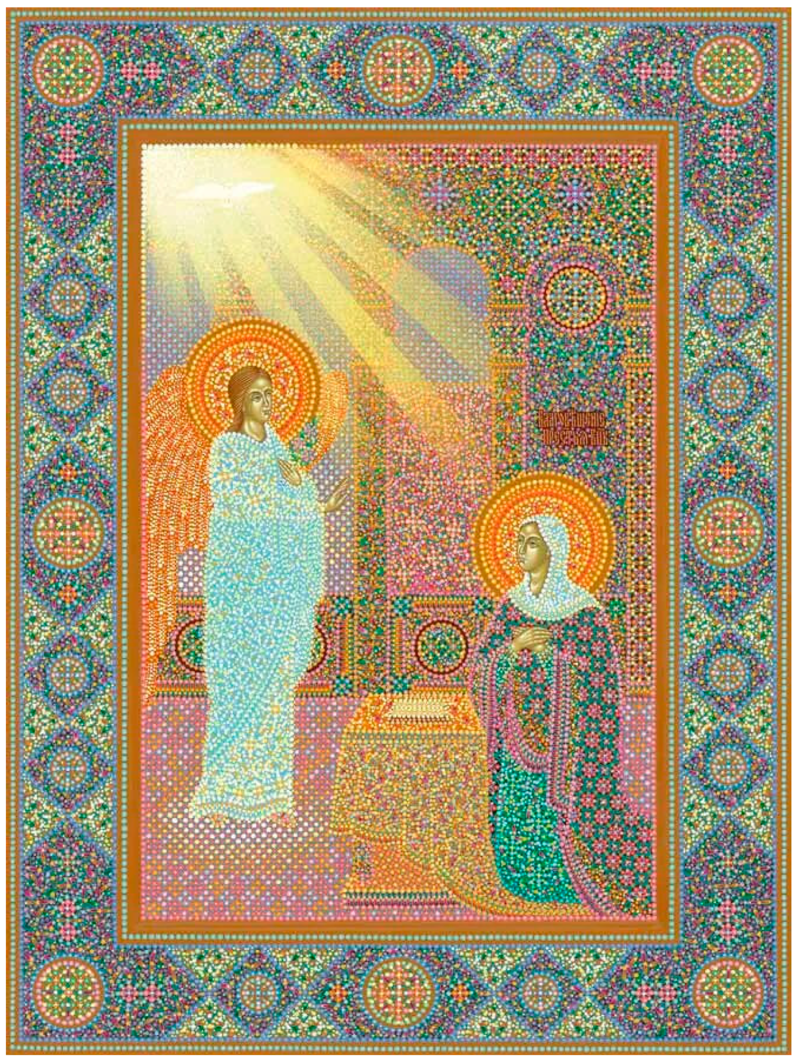 In painting, there are also works that are not fantastical but “testimonial,” where color becomes a means of “narratively” describing a spiritual space apprehended through inspiration. In the later stage of his career, Svetoslav Roerich used color to depict the light of other worlds, without delving into their geometry. The early 21st-century icon painter Yuri Kuznetsov, using his “pearl-like technique” (a combination of pinpoint dots of paint—sometimes of opposite color), represented the spiritual light corresponding to a particular iconographic image. In this approach, the special geometry of the icon’s artistic space (reverse perspective) is replaced by a color wave, which is also capable of shaping the perception of a landscape—for instance, interpreting the colors of a sunset as a glow of the spiritual world (