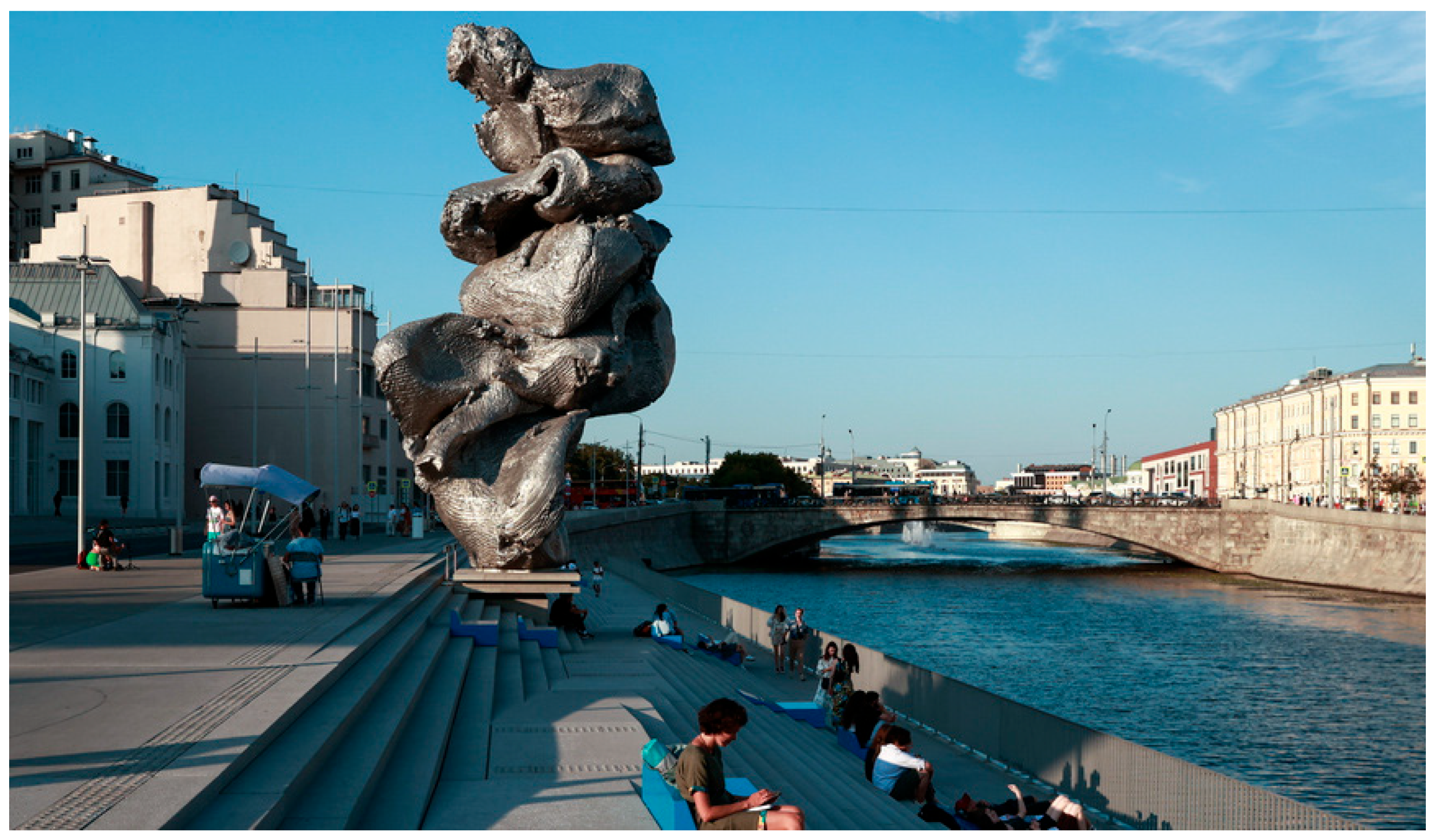 Figure 2), which, according to his intent, presents the act of creation, formation, and transformation. It was exhibited in New York (2015) and Florence (2017), and from 2021 to 2025 was located in the center of Moscow on Bolotnaya Embankment, in front of the entrance to a contemporary art center, before being moved to a less pretentious location. Situated in the city’s historic center, the sculpture spawned emotional tension through its incongruity with the architectural style of the surrounding landscape and provoked heated discussions.