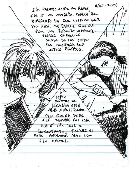 Although some participants initially hesitated, they gradually embraced the limitations of materiality and memory, producing drawings with increasing intensity and confidence. Participant A, in the You See It, When It Sees You activity, used bold lines to depict his confrontation with the samurai protagonist Kenshin from the manga work Rurōni Kenshin (Watsuki 1994), wielding a pen as participant A’s “sword” (Figure 1). Kenshin’s dialog—“I need to know this guy’s style”—reframed participant A as an adversary to be evaluated through technique. This choice was particularly striking, as participant A and I had just discussed his evolving drawing style. From his initial hesitation, participant A shifted to an intense, heavily hatched drawing that filled the session’s entire timeframe. He later explained that the image was shaped by his exhaustion from spending eight hours revising dialog on his manuscript the day before. The activity condensed this experience into a powerful visual metaphor. This transformation illustrates how irrevocability can generate not only deeper engagement, commitment, and creative transformation in artistic practice, but also self-reflection and conversation between participants and researcher.