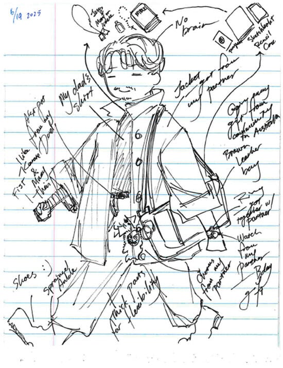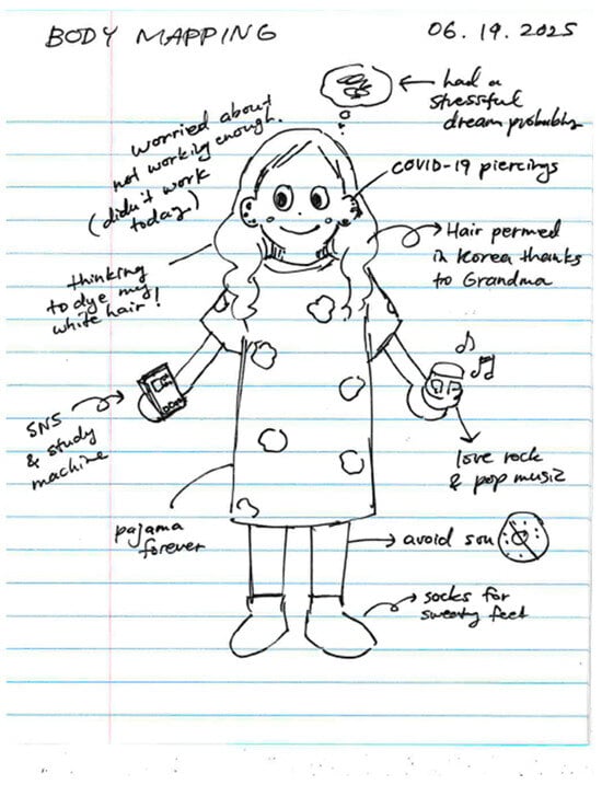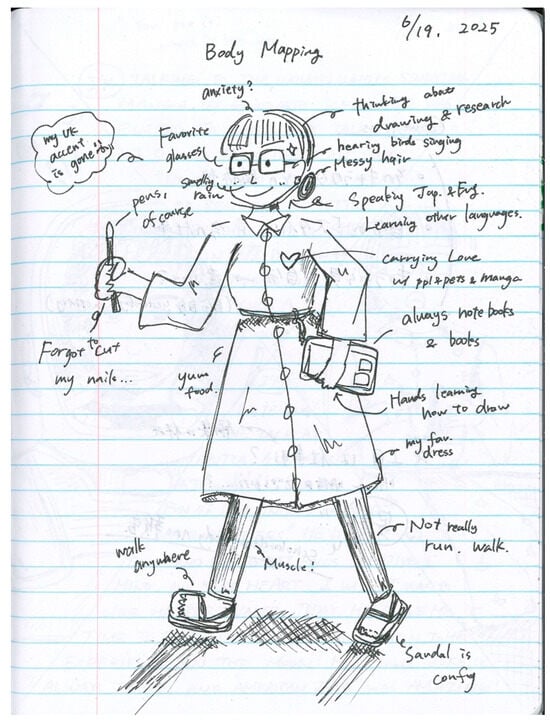 Czerwiec’s own description of the activity is available on her blog (Czerwiec 2023), where she demonstrates different variations by other graphic novel authors and medical specialists. While the materials can be varied, the core prompt is the same: body mapping encourages participants to visualize themselves in time and space by drawing a full body and surrounding it with material and affective elements (e.g., clothing, objects, emotions). Czerwiec’s (2023) blog provides model questions such as “Consider literal things on your body like scars, tattoos, other imprints—what stories do they tell and how do you represent these visually?” and “What about the culture(s) you were raised in—how do those traditions enact themselves on your body?” In this study, I presented my own body map (see Figure 7) before inviting participants to create theirs. Using a single sheet of paper, a pen, and a timing device, participants completed the activity in approximately 20 min, drawing their bodies in either realistic or stylized form and adding details based on the model questions.
