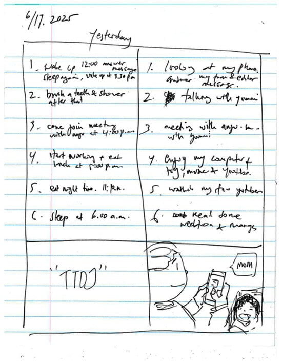 My findings extend upon previous studies by emphasizing how Lynda Barry’s material-centered and analog practices can serve not only through individual reflection but also as a space of care for international artists working under structural limitations. For this study’s method, I drew inspiration from Barry’s approach to comics-making, which foregrounds reflection, memory, and material practice (Barry 2002, 2019). Her exercises prompt participants to revisit past selves, imagine alternative futures, and externalize interior states. A distinguished scholar on comics and graphic novels, Hillary Chute (2010) emphasized Barry’s physical and material creation with reference to Barry’s concept of autobifictionalography, which merges autobiography and fiction. This combined term reflects Barry’s belief that personal narratives are never purely factual but are partially imaginative. Chute traces the term “fiction” back to the Latin fictio and its verb form fingo, meaning “to make by shaping from clay, wax, molten metal, and so on” (Chute 2010, p. 109). Thus, materiality is inevitable in Barry’s autobifictionalographical practice. Similarly, Hil Malatino (2020), in their book Trans Care, describes Barry’s exercises as enabling radical forms of self-recognition and self-care. Echoing these perspectives, the international artists shared their everyday lives and showed their care. For instance, participant D described her career trajectory—from a childhood dream of being a soccer player to an art teacher to a manga artist—as shaped by irrevocable decisions that nonetheless converged in a fulfilling practice. Her comics on family relationships and long-distance caregiving demonstrated how drawing can articulate complex ties across national and emotional boundaries (Figure 4). She emphasized how her family and partner supported her career trajectory, and so she takes great care of them during her time working in Japan. In this way, Barry’s material-centered approach becomes a conduit for care, enabling artists to connect, reflect, and support one another across cultural and personal boundaries.