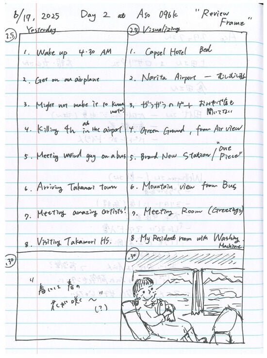 This section highlights three Arts-Based Research (ABR) activities adapted in this study—“Review Frame,” “You See It, When It Sees You,” and “Body Mapping”—to examine the creative processes of international artists during fieldwork at Artist Village Aso 096k. Each activity was developed as an expanded version of Lynda Barry’s comic-making methods (Barry 2019), with modifications tailored to the target population of this study. The following first outlines Barry’s original instructions and then describes the adaptations implemented during fieldwork. As an overarching rule of Barry’s pedagogy, in this study, only accessible materials were used: felt-tip pens and blue books, which are several-page booklets commonly used for written exams in U.S. universities. Each day, I first shared my own model works (Figure 5, Figure 6 and Figure 7) to demonstrate possible outcomes while emphasizing that the participants’ interpretations were not limited by these examples. All sessions were audio-recorded to preserve field data.