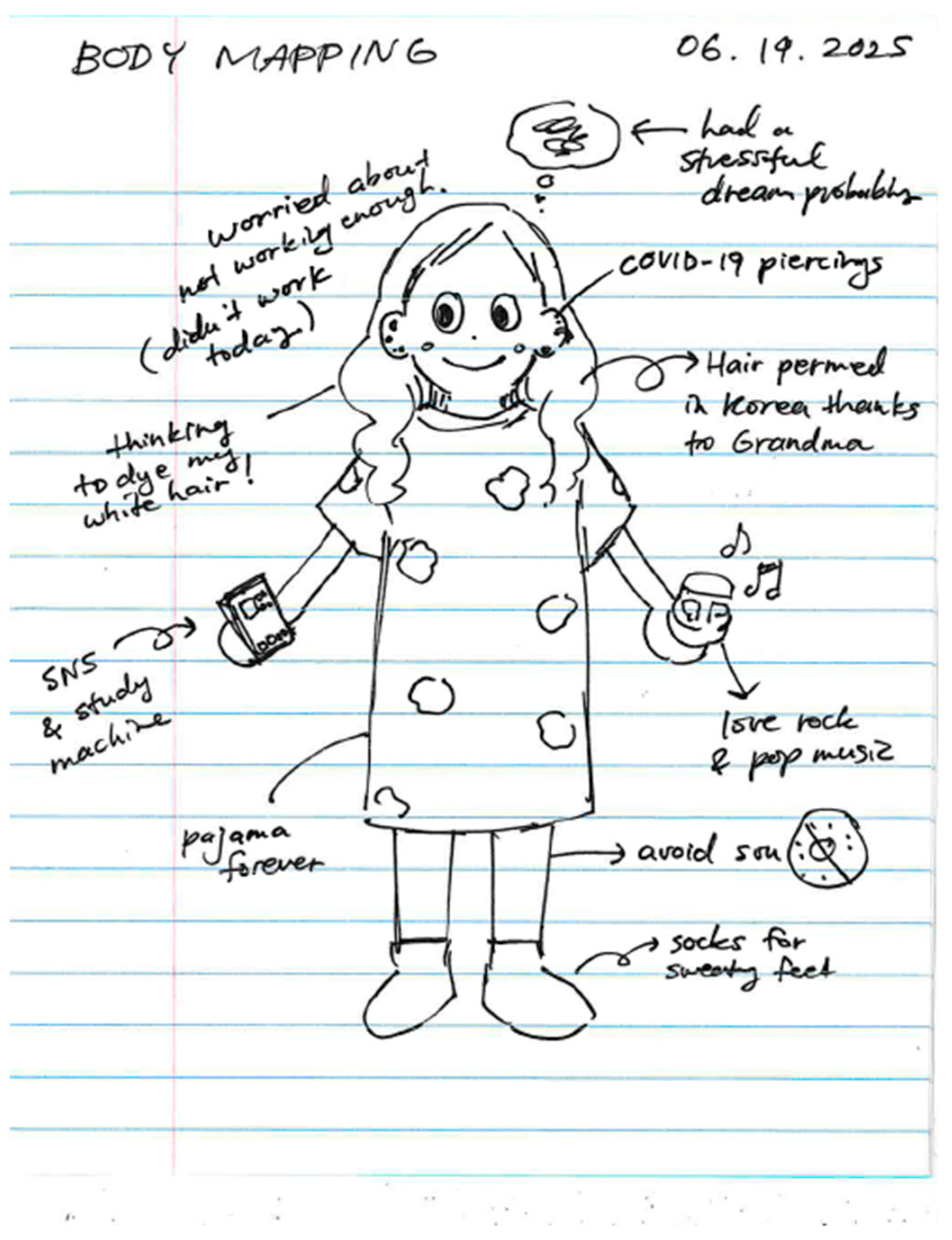 Figure 2). Although her parents’ views have since changed, they initially believed that “art is not real job.” She also expressed the fear that her entry into the manga industry came “too late” compared to other professional creators, leaving her with a persistent sense of “not working hard enough.” Through body mapping, she visualized these pressures, situating them within broader cultural beliefs about work and legitimacy. During our conversation, she expanded on these images by sharing her family background and life experiences. Such sensitive cultural reflections emerged through this drawing method, with the body mapping activity effectively capturing these moments of embodied self-expression.
