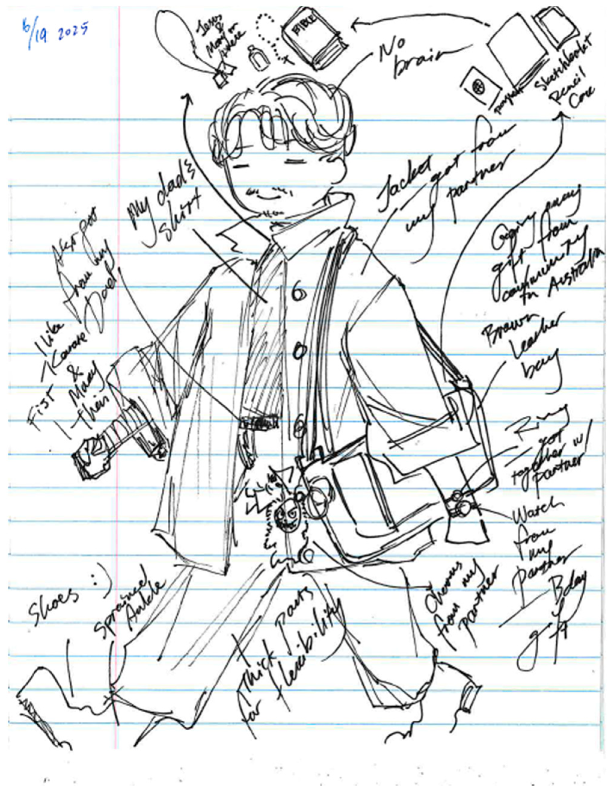 Figure 3) depicted his personal belongings, past injuries, and religious and cultural symbols. His illustration included memorable objects—such as a bag, shirt, and key chains—as well as elements of his new life in Japan and the community he belongs to. For instance, he carefully described the significance of a leather bag gifted by his cultural heritage community in Australia; a shirt from his father that he and his colleagues in the artist village joked resembled “a Steve Jobs shirt”; and numerous keychains from his partner. He also noted a lingering ankle injury that still caused pain when stretching. The injury was sustained during a short fieldtrip to the famous shrine near the artist village. Participant B meticulously shared the background stories of each item in his illustration, including those related to his religious practices. Among the many memories represented in his drawing, the most striking element was his passport, which he carried daily. Although he did not explicitly describe it negatively, I interpreted it as a constant reminder of his foreigner status in Japan. Hence, through body mapping, the participants articulated embodied narratives that intertwined the personal, cultural, and political dimensions of their lives, revealing how identity is expressed at both the material and symbolic levels.