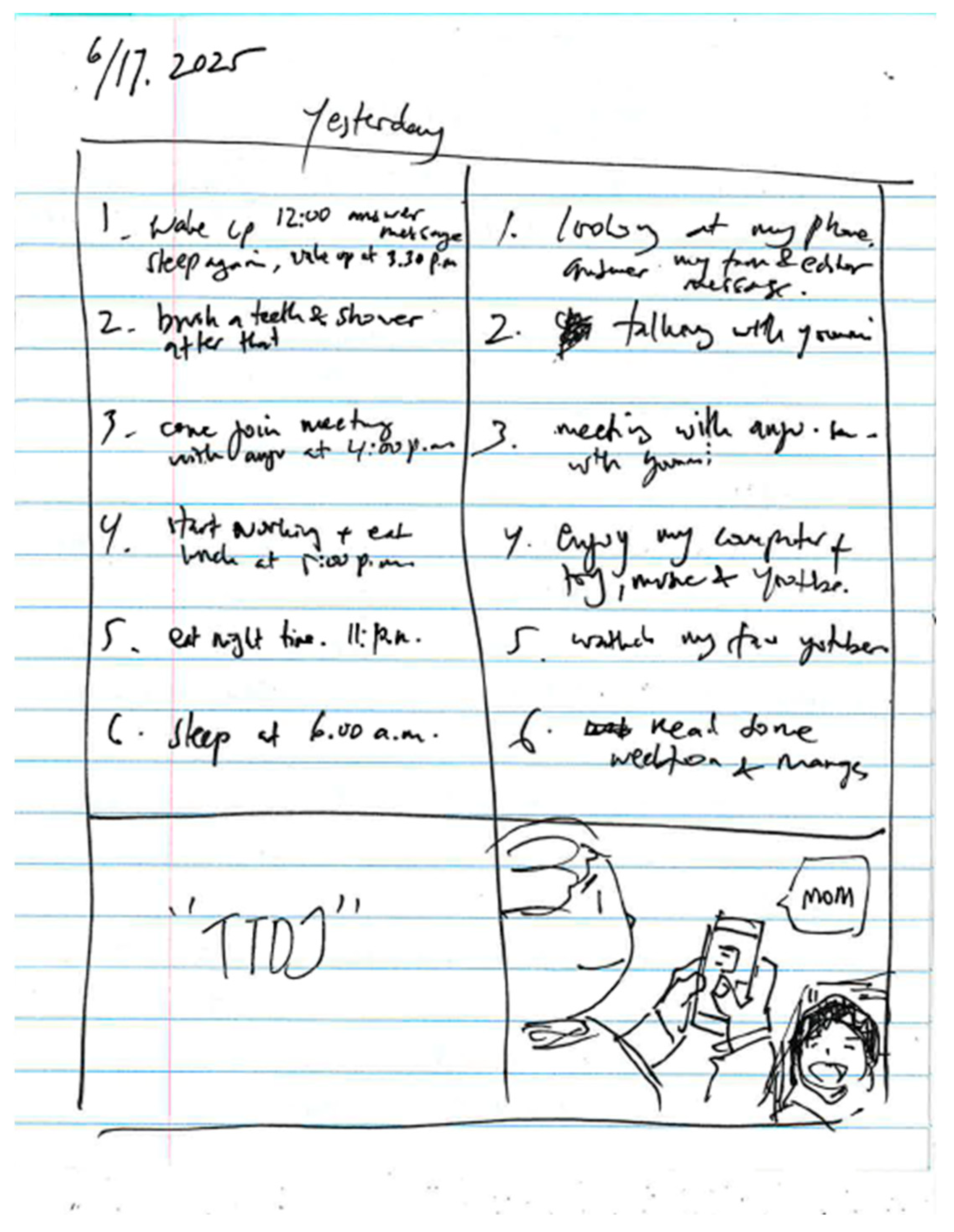 For this study, the activity was conducted as an icebreaker at the beginning of the one-week period to establish rapport and to better understand the daily routines of the participating international artists. The page structure and questions followed Barry’s design, but the time frames were relaxed to accommodate participants’ adjustment to the method.