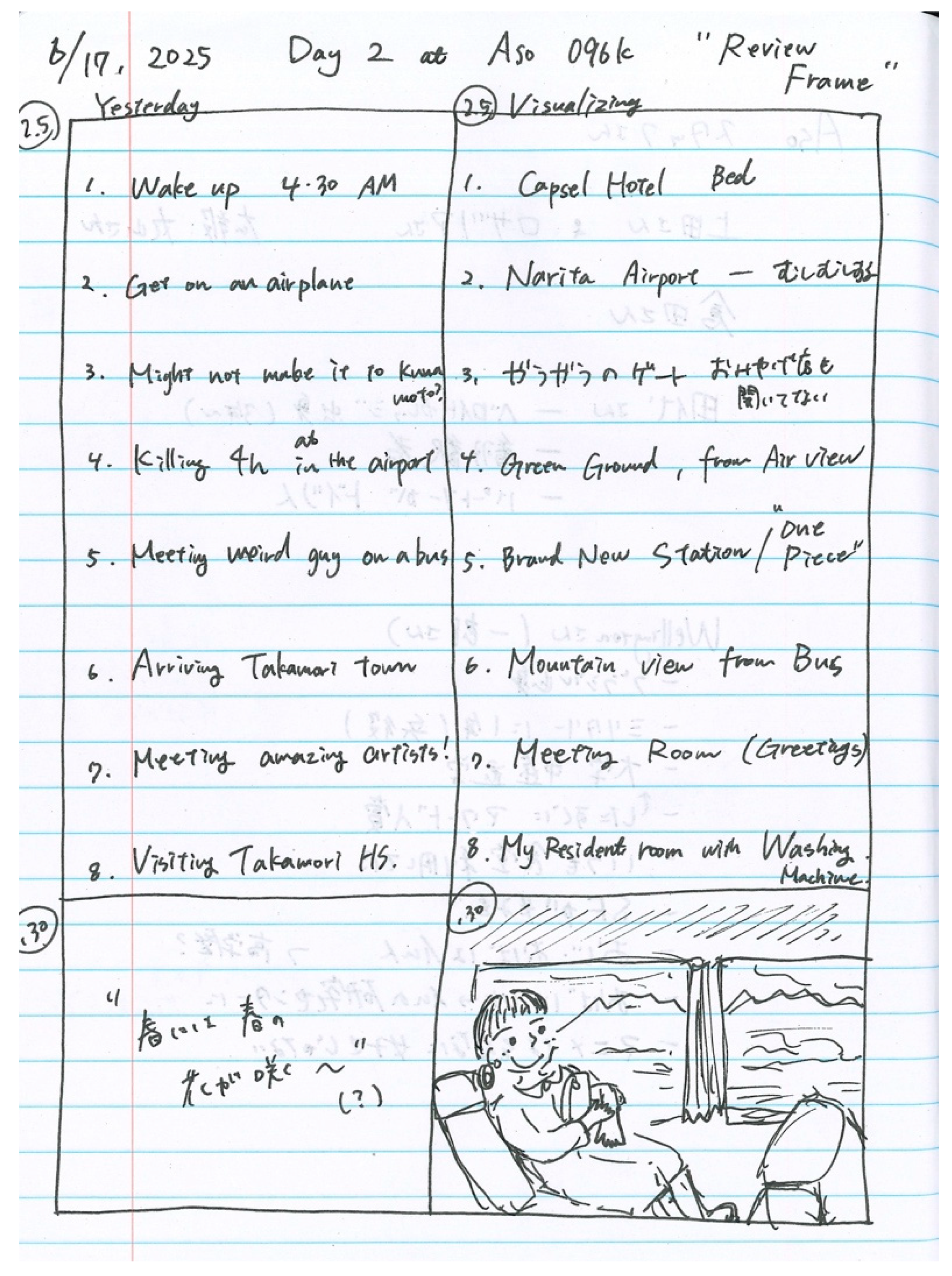 This section highlights three Arts-Based Research (ABR) activities adapted in this study—“Review Frame,” “You See It, When It Sees You,” and “Body Mapping”—to examine the creative processes of international artists during fieldwork at Artist Village Aso 096k. Each activity was developed as an expanded version of Lynda Barry’s comic-making methods (