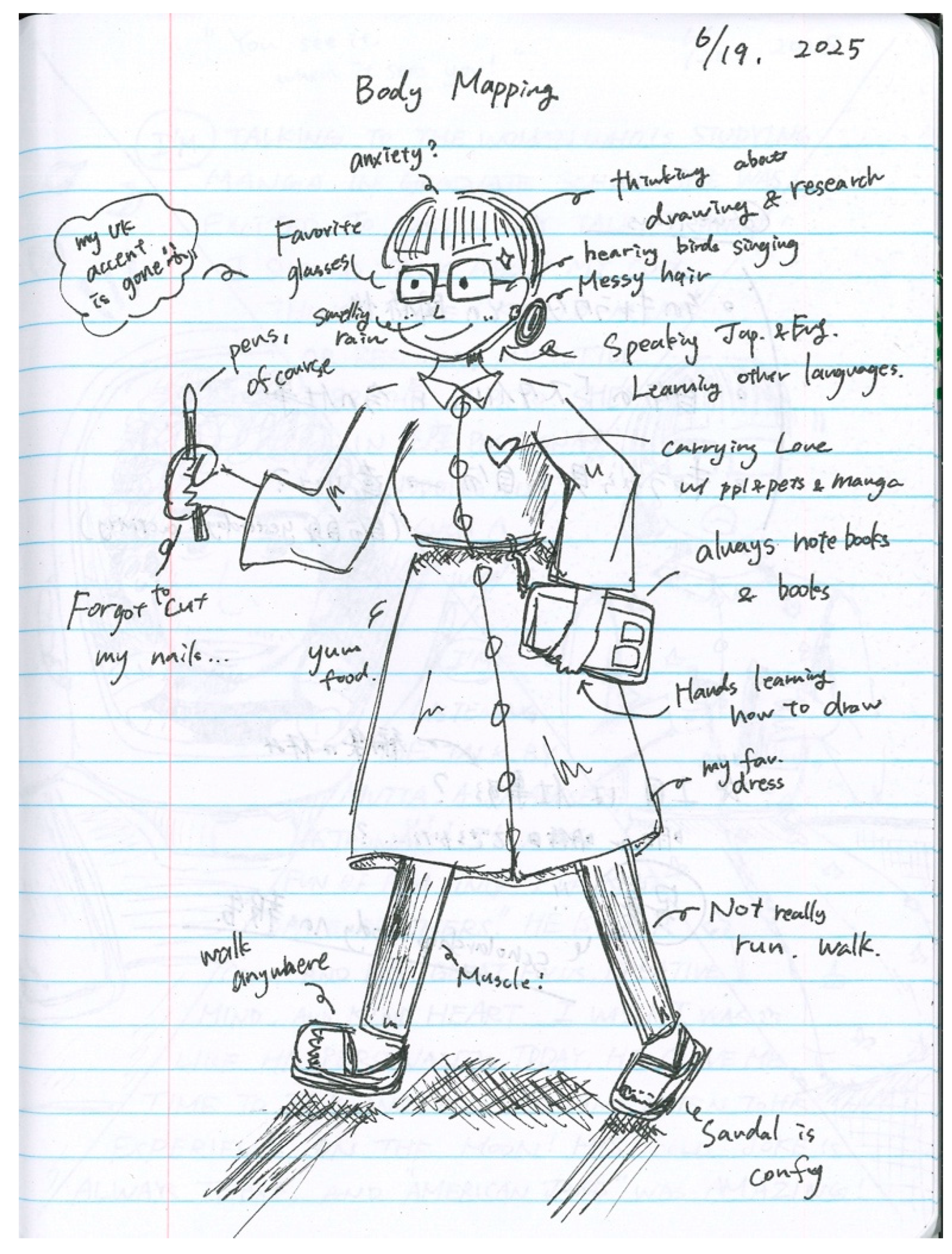 2023) blog provides model questions such as “Consider literal things on your body like scars, tattoos, other imprints—what stories do they tell and how do you represent these visually?” and “What about the culture(s) you were raised in—how do those traditions enact themselves on your body?” In this study, I presented my own body map (see