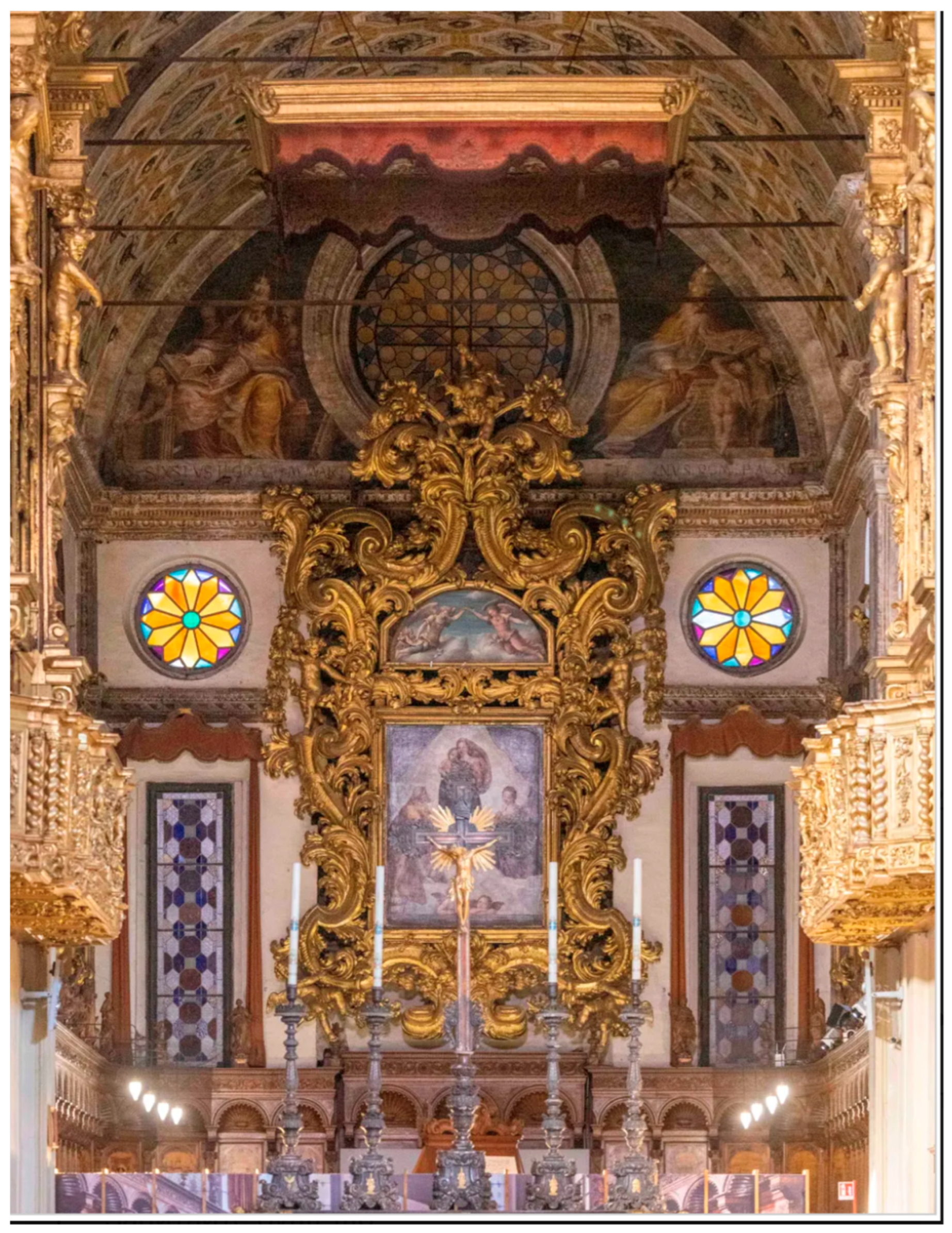 The first consisted of the monastic community, located in the choir directly before the altar, viewing the painting from a distance of approximately 5–10 m at a steep upward angle, under strong lateral illumination. The second comprised the lay congregation standing in the nave, some 40–50 m away. For them, the painting functioned not as a close devotional image but as an optical symbol integrated into the architecture of the apse—a third “window” of heavenly space between the two real ones.