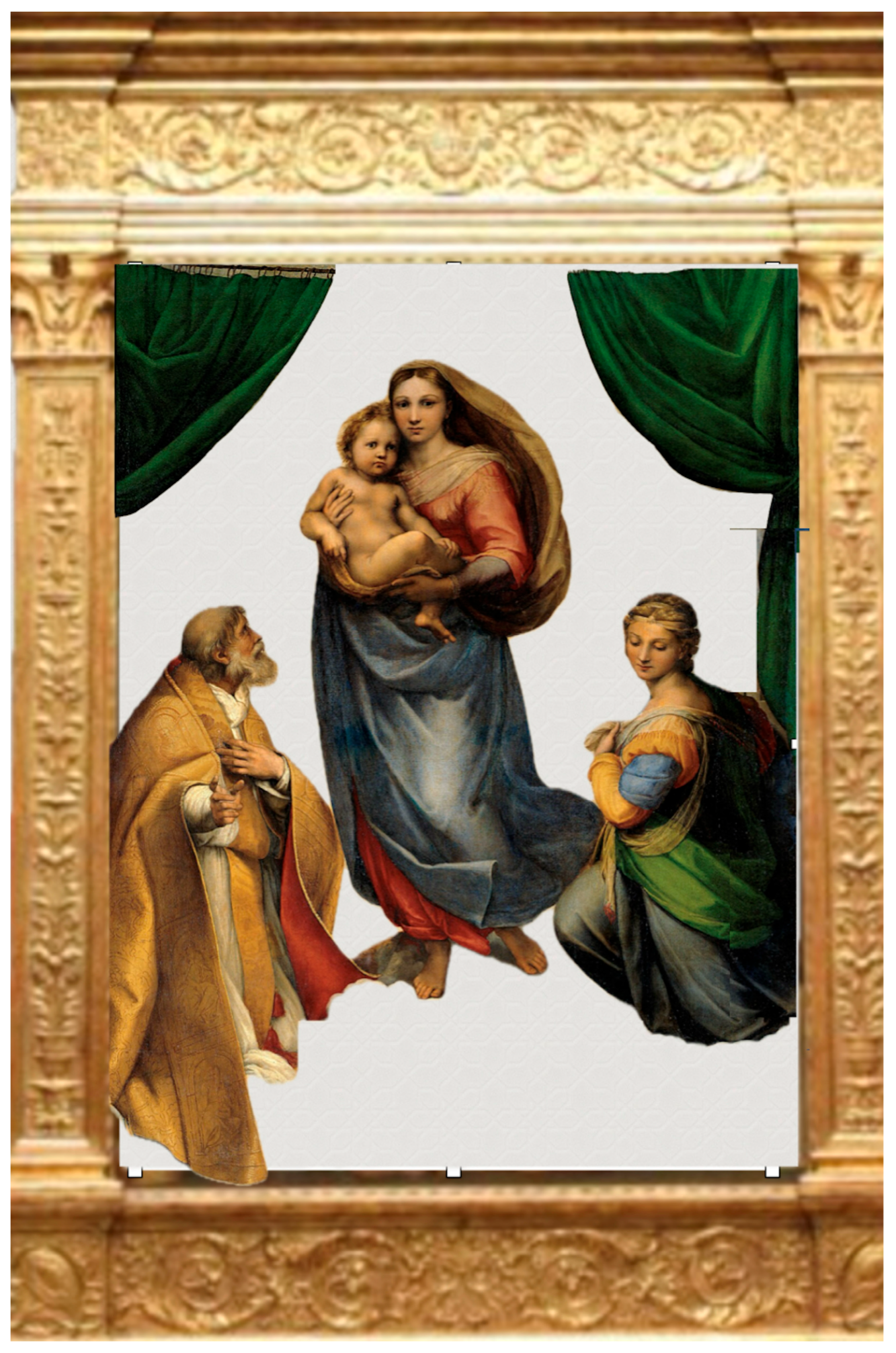 Yet Raphael deliberately excludes the Virgin herself from this frame. She is not a component of the construct but an apparition sustained by it. No curtain appears above her head: the artist grants her precedence in every structural hierarchy. By parting the drapery, he leaves only a narrow visual crossbar—a frame that does not confine but releases air and movement, allowing the composition to rise and breathe. Raphael opens the space above the Madonna and positions Sixtus and Barbara so that their restrained stillness heightens her ascent and her freedom of air.