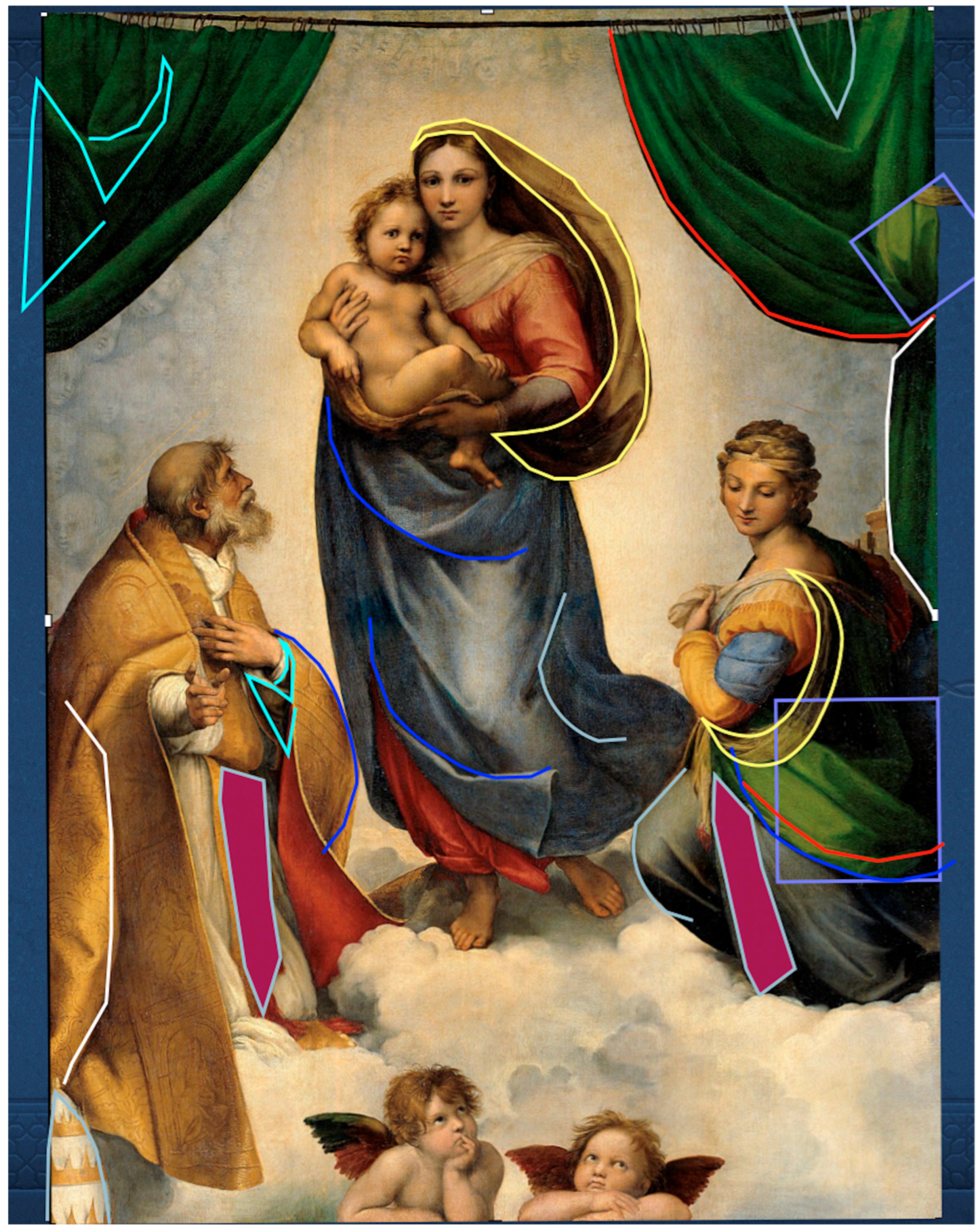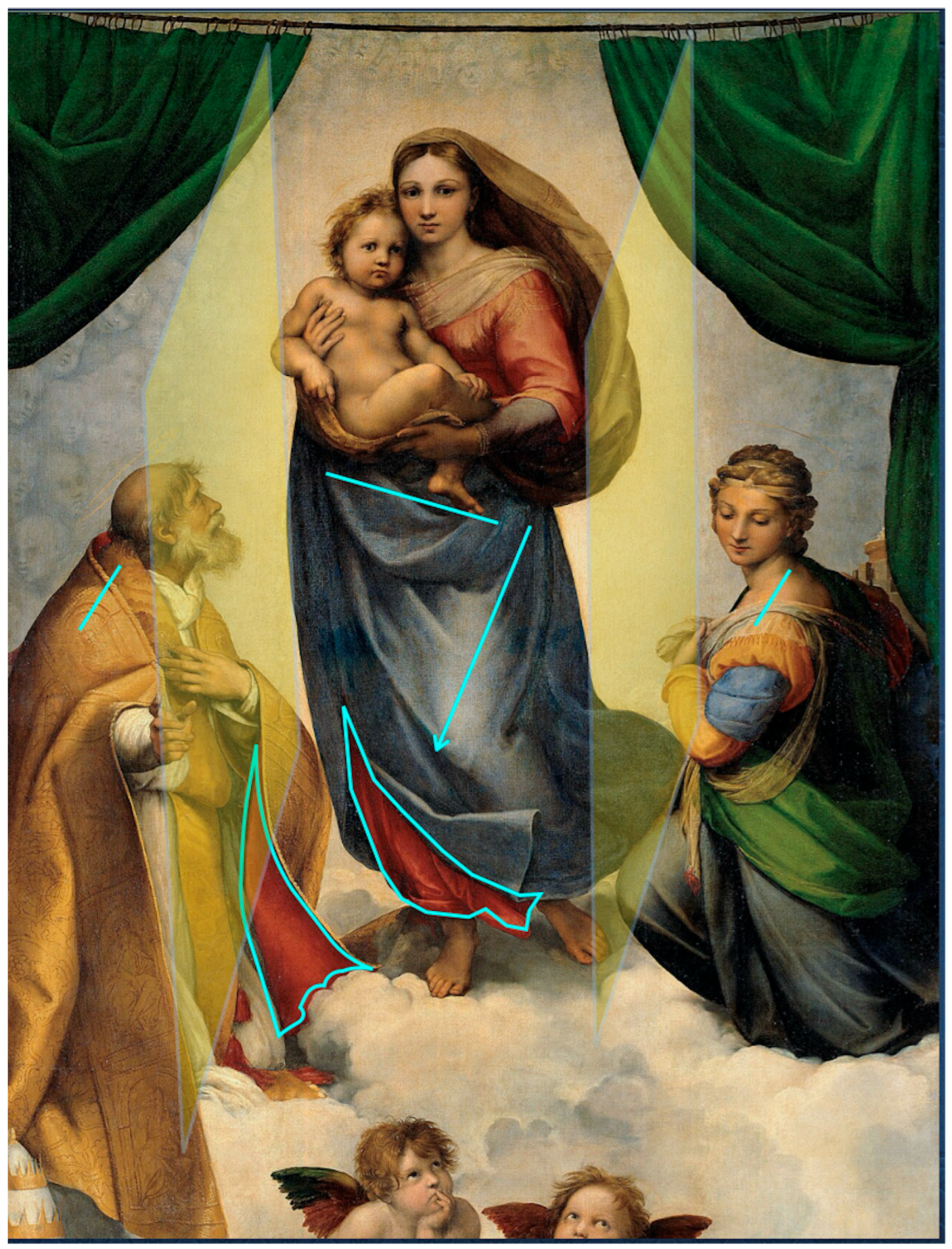 Extending this line of reasoning, the composition of the Sistine Madonna is considered here as a multilayered system built according to the principles of visual engineering. Such a view requires several complementary modes of analysis capable of identifying how the different constructive levels of the painting function together.