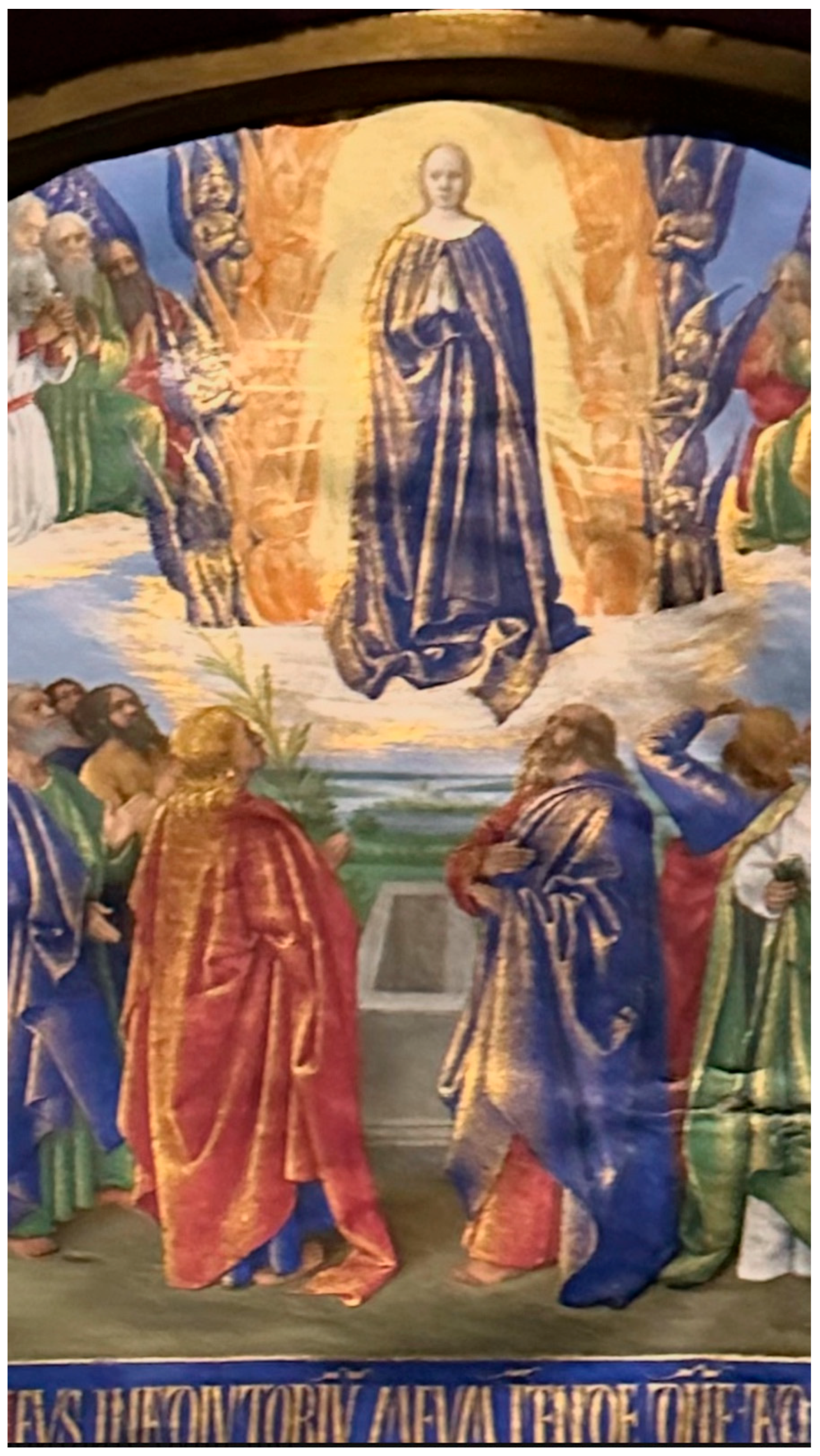 The deep fold of Mary’s skirt encircling the group functions as the pericardium—the external membrane that contains the energy within the form.