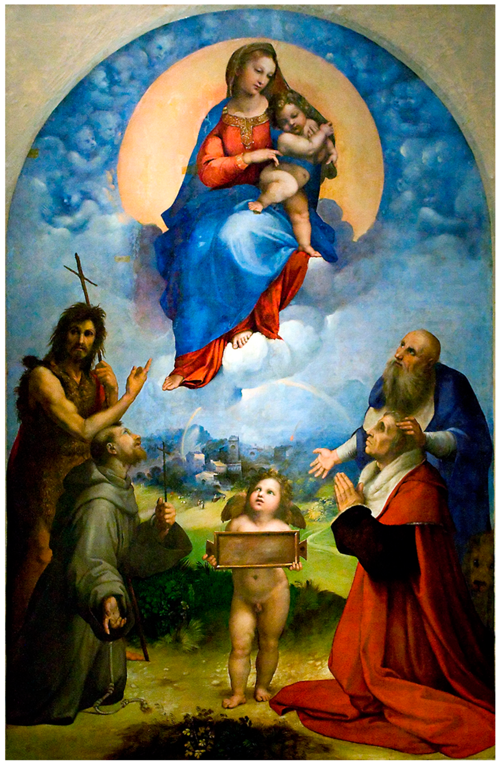 Yet the constructive system of the Madonna di Foligno remains discontinuous. The composition in depth breaks into layers that do not interlock: the lower group functions as a separate register rather than a structural continuation of the upper one. The Virgin appears oversized in relation to the excessively distant landscape and remains visually foreign to the cloud mass surrounding her, as the circular mandorla forms a rigid halo that neither supports nor integrates with the surrounding atmosphere. Spatial depth collapses between mismatched planes: the putti and the forward edge of the donors are pushed so far toward the viewer that the divine apparition occurs behind them, leaving their reactions compositionally unanchored; the figures of the second tier are placed too close to the Virgin, producing an effect of visual flattening, even though their gestures are directed toward an event conceived as distant and elevated. Illumination likewise fails to unify the scene: a rightward light source brightens the far landscape more strongly than the donors in front of it, inverting atmospheric logic. As a result, the vertical axis relies on compensatory devices—the putti, the small dark pool below, and the strongly whitened knee of the Virgin, which acts as an additional luminous support, pushing the viewer’s gaze upward and preventing it from sinking into the void between the tiers. The work thus captures a transitional stage in which constructive principles are tested in isolated components but not yet fused into a coherent architectural whole, as they will be in the Sistine Madonna.