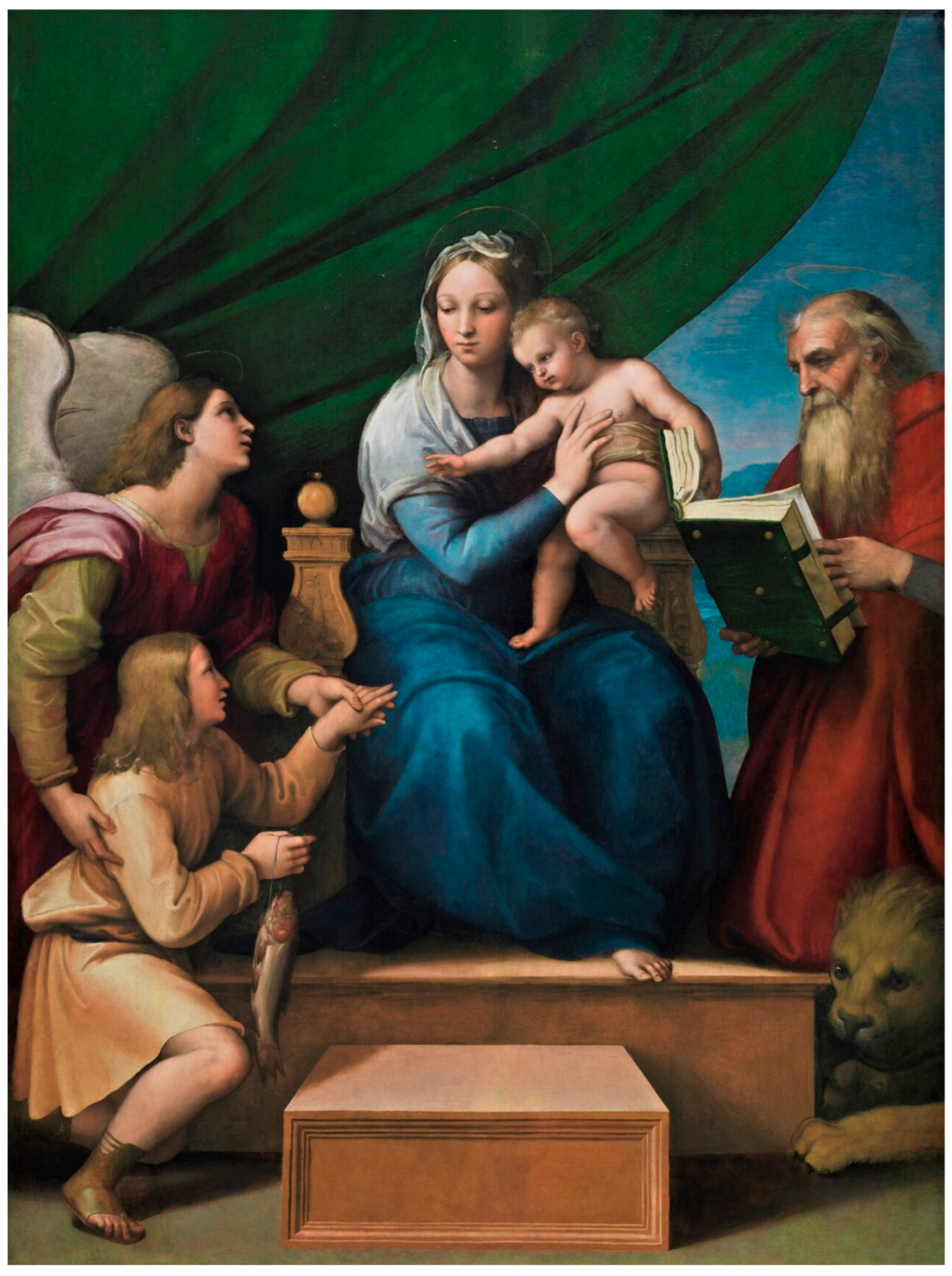 A later and markedly different constructive variant appears in the Madonna of the Fish (1513–1514), painted after the Sistine Madonna. Here (
