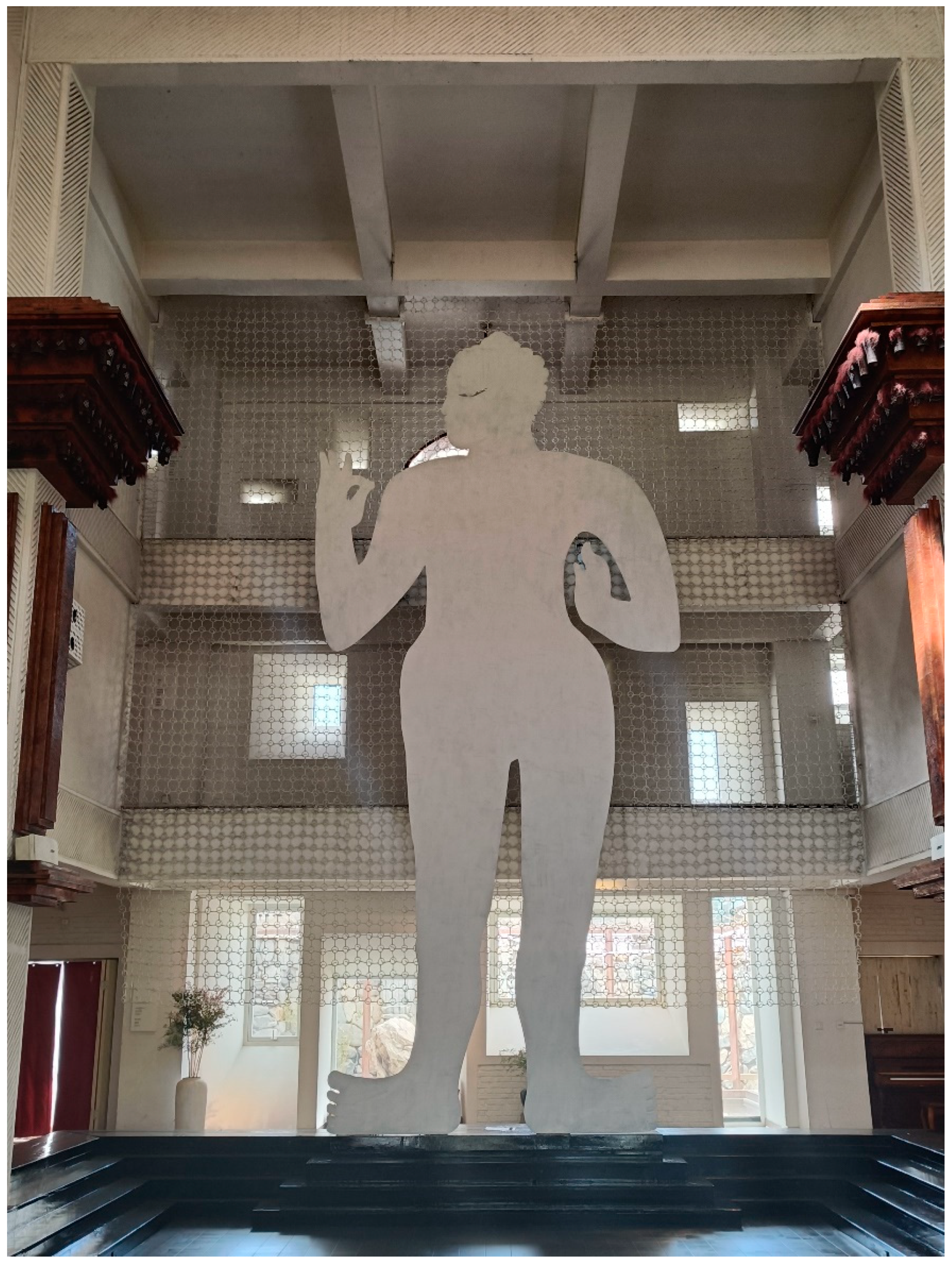 Gan et al. 2025). In my performance, after the climax of tearing Xuan paper, the short breath forced me to crawl on the ground. After crawling, the hypoxia made it impossible for me to adjust my breathing rhythm, so I was compelled to slowly sit back onto the stairs under the Buddha statue (Video File, 17: 19). Sitting on the stairs, I did not suppress my gasping sounds; instead, I amplified them. The amplified breathing sounds became the authentic sound effects of the performance, transforming “breath”—the most fundamental sign—into the core medium of artistic expression. Thus, the audience perceived a real life struggle instead of stage performance. According to ccontemporary performance studies, certain performance forms can lead to authenticity in ways that evoke perceptions of lived reality (
