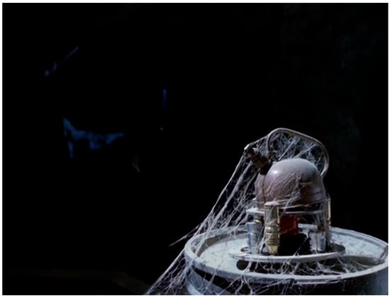 In one of his flashbacks in the Memorial episode, crewmember Kim encounters two Nakan people hiding in a cave trying to escape the massacre. Kim, who “participates” as an aggressor, shoots and kills them, exacerbating his traumatic memory. When returning to Tarakis as part of the attempt to relieve the crew of the painful flashbacks, Kim enters the real cave, recalling the event. He discovers the remains of the two murdered Nakan alongside everyday objects—a teapot perched on a burner and some plates (Figure 12). These are emphasized vis-à-vis the viewer by close-up shots. The objects are covered with cobwebs yet, placed on pedestals, they glow in dim light, rendering them reminiscent of a display or photograph of everyday objects in memorial museums.