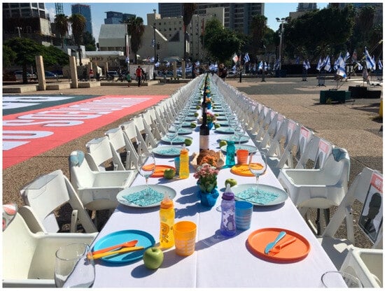 Shabbat dinner table installation representing hostages in Hostages Square, Tel Aviv, installed 20 October 2023. Photographed by Yossipik (photo source: Wikimedia Commons, https://commons.wikimedia.org/wiki/File:Shabbat_Dinner_table_representing_the_hostages_and_missing_people,_The_October_7_attack.jpg, accessed on 21 December 2025).